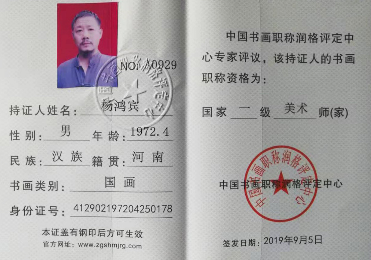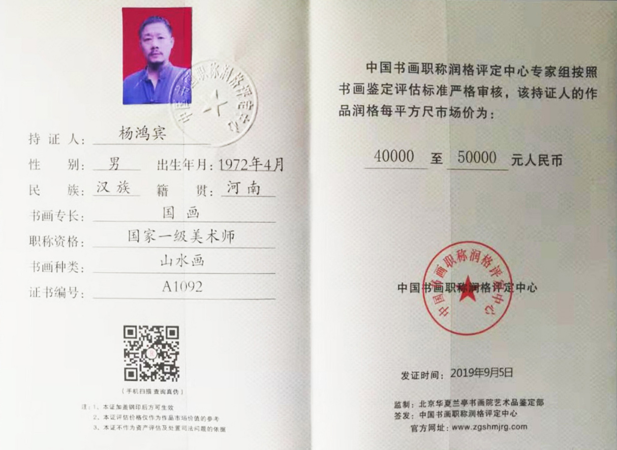 杨鸿宾:号一石草堂主人中国当代著名书画家,国家一级美术师,中南海国礼书画家,国家评价市场润格50000元/平尺。张大千、黄宾虹再传弟子,师承胡若思、李可染、黄努卫等书画泰斗。北京美术家协会会员,中国收藏家协会会员。现任中国华夏书画院院长、中国下一代教育基金会爱心慈善大使、中国国际文化交流促进会院士等职。又先后获得“德艺双馨艺术家”、“书画双绝”、“中华爱国艺术家”等称号和荣誉。其作品在国内外艺术大赛屡获金奖,并得到国家领导多次会见。代表作《秋山读书》《长城雄风》《旭日东升》《鸿运当头》《紫气东来》等多幅作品曾作为国礼赠送外国元首,并被国家党政机关和个人所收藏,成龙、刘德华、陈光标、马未都等都曾收藏其作品。