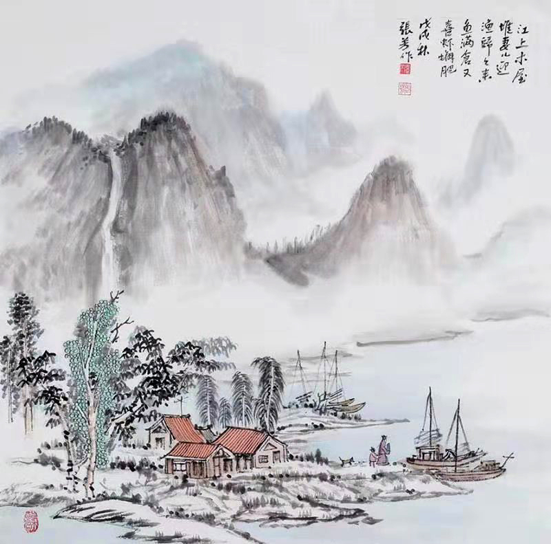 一个不注重书法的画家,是必定走不远的,山水小写意画与工笔不同,是讲究章法的,而不是乱画。没有一个高的理念,画作永远上不去。一幅好的山水画,画面有虚有实,有远有近,清和雅逸,意境悠远,笔墨齐全,下笔之精准,缺一不可。
