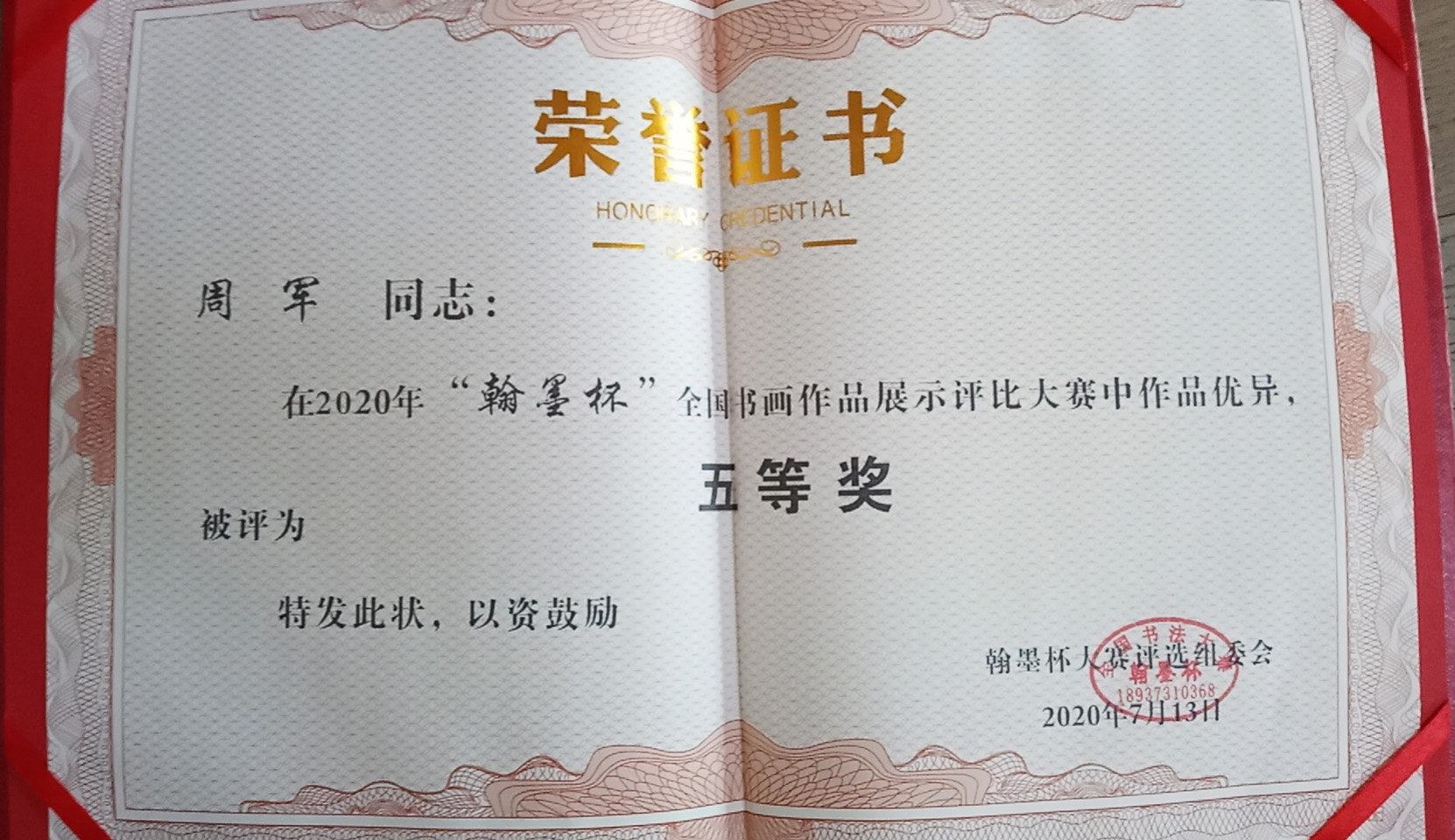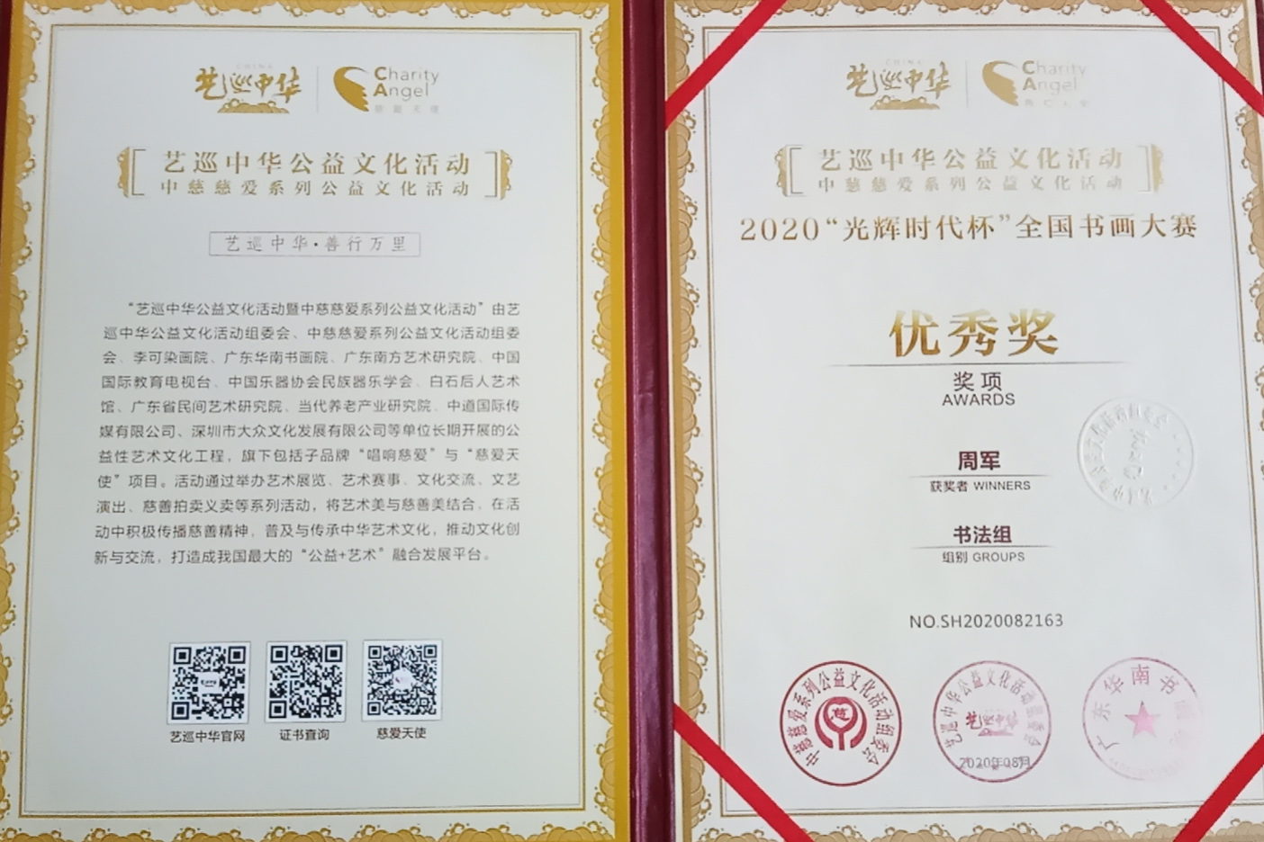 2020年参加艺巡中华光辉时代杯全国书画大赛获书法组优秀奖,同年参加全国墨韵中华杯获金奖,其书法作品人选《中华当代书画作品博览》,其优秀作品入选共和国记忆限量版珍藏邮册。