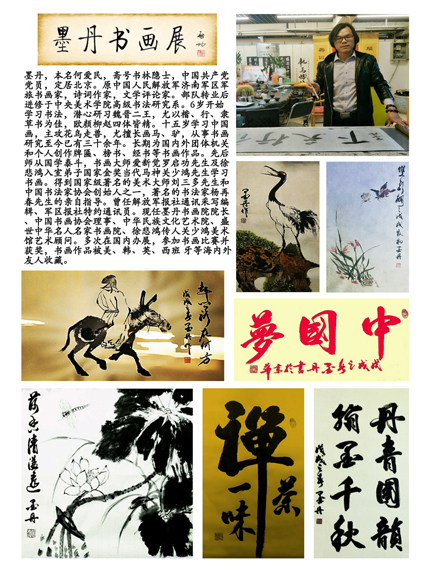 墨丹,本名何爱民,斋号书林隐士,中国共产党党员,定居北京,研究生学历,一级书画师,中国书画协会终身会员理事。原中国人民解放军济南军区政治部军旅书画家,诗词作家,文学评论家。部队转业后进修于中央美术学院高级书法研究系。6岁开始学习书法,潜心研习魏晋二王,临池不缀,入古出新,涉猎欧体,尤以楷行、隶、草为佳,欧颜柳赵四体皆精。十五岁学习中国画,主攻花鸟走兽,尤擅长画马、驴,从事书画研究至今已有三十余年。先后师从国学泰斗,书画大师爱新觉罗.启功先生及徐悲鸿入室弟子国家金奖当代“马神”关少鸿先生学习书画。得到国家级著名的美术大师刘三多先生和中国书法家协会创始人之一,著名的书法家杨再春先生的亲自指导。2008年8月成立北京墨丹书画工作室,两年后成立书画院,现任北京墨丹书画院院长、中华民族文化艺术院,盛世中华名人名家书画院,徐悲鸿传人关少鸿美术馆艺术顾问。 1997年中国人民解放军济南军区庆祝香港回归楹联书法大赛一等奖;2000年中国人民解放军庆祝澳门回归1周年书画大赛二等奖;2003年在济南军区组织的“贺新年”官兵春联创作展中书法作品被评为第一名;书画作品《观沧海》在2003年中国人民解放军总政治部“纪念他诞辰110周年”获书画大赛二等奖;全国“祖国颂杯”书法大赛二等奖、全国诗书画大赛中获三等奖、全国”兰亭序“杯书法大赛中获优秀奖。书画作品曾多次在《解放军画报》、《中国书法报》、《东方书画报》、《青少年书法》等专业报刊发表,十年来一直热衷于希望工程慈善事业,书画作品为贫困山区失学儿童义拍捐献,曾多次被中央电视台现场采访报道,多家报刊杂志专门对书画作品做封面展示。作品被日、韩、英、美、西班牙等海内外各界人士广为收藏。
