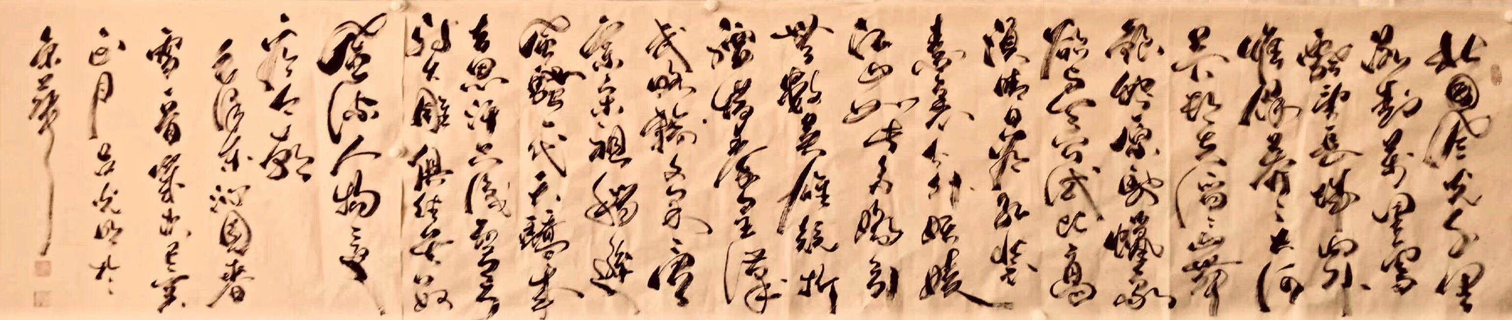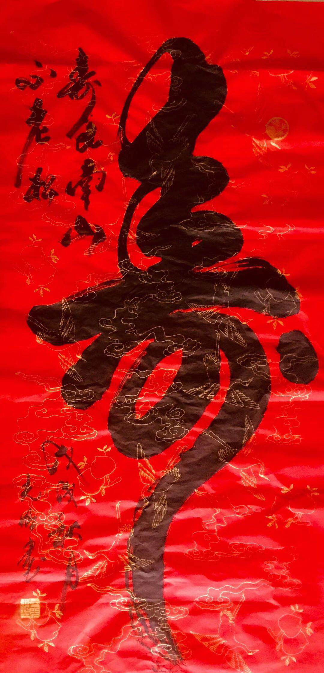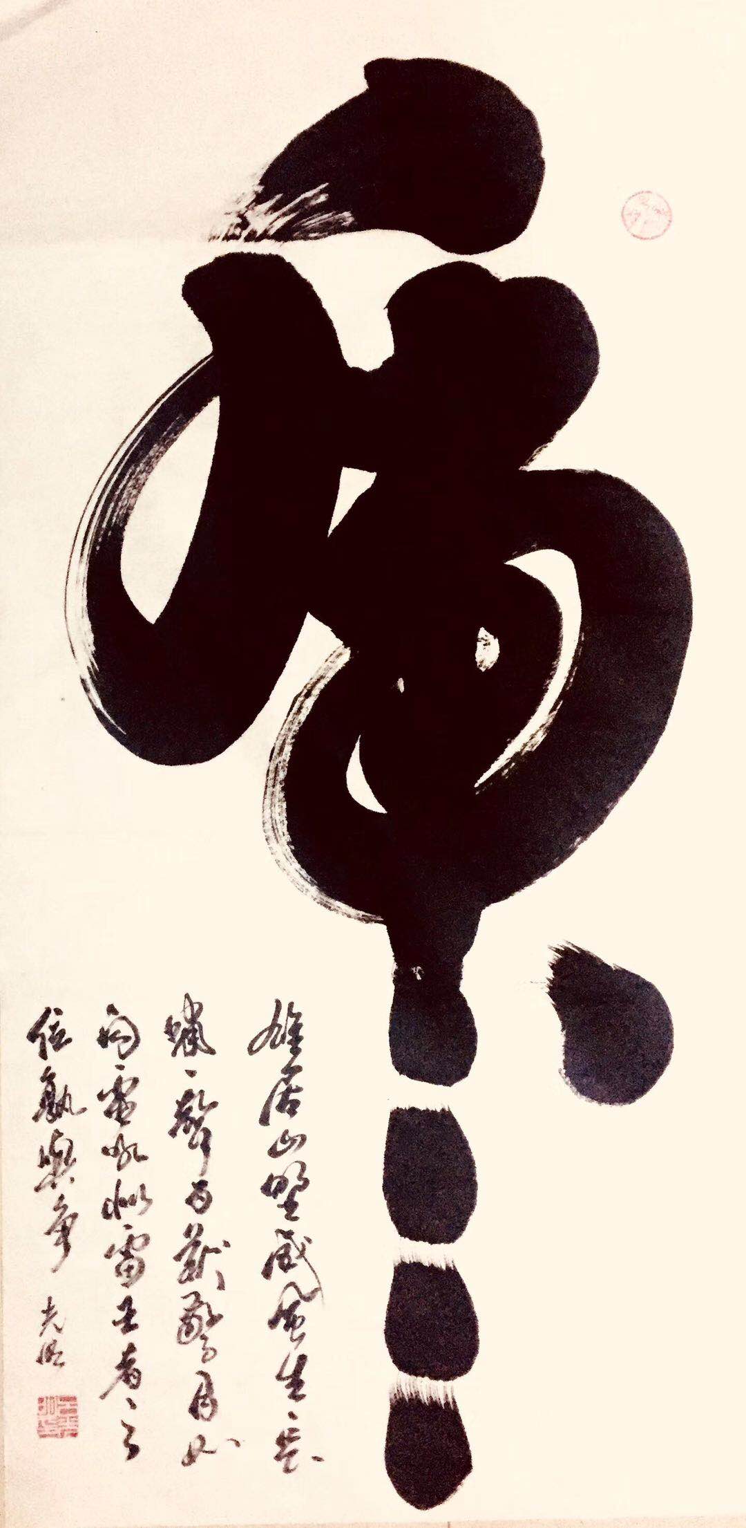 受唐太宗李世民飞白体书法影响,经过长年的练习,领悟出一种浓墨飞白体书法,所写文字都充满动感,为中国书坛增添了一条绚丽的风景线。