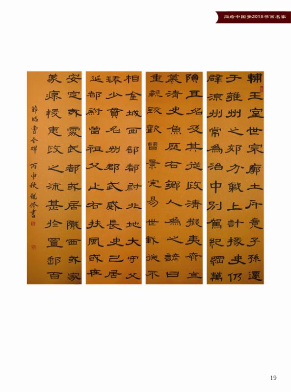 书法作品在”盛世中华.我的中国梦”全国书画名家作品大展赛中获金奖,并授予中华书画名家荣誉称号。作品入编《盛世中华,我的中国梦中国书画名家作品典藏》;
