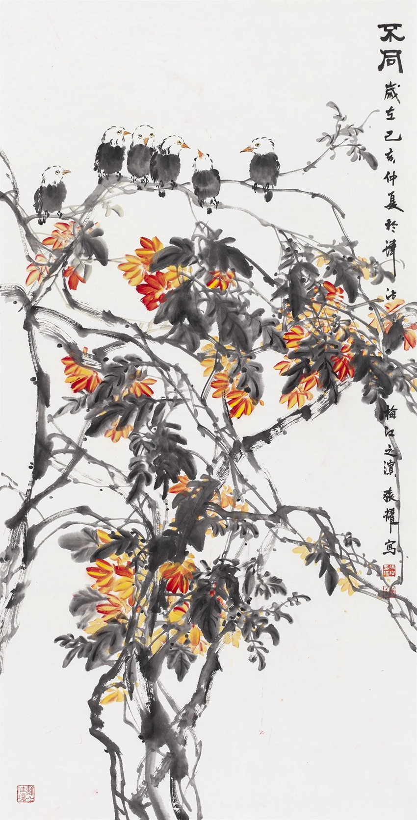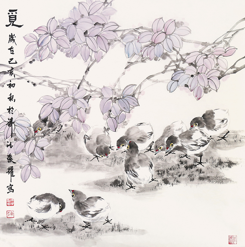 多年来,他究心于作品的内在语言和情感,也重视形式对内容的承载与统一。他对自然界的事物好像都有着特殊的感情,山川河流,百卉鸟兽,撩拨着他的灵感。这是深读张耀作品时所能品味到的。他究心于一花一草的变化,并能从它们的微妙变化中察觉这些生命内在的律动,而且能把这些律动与他的书法用线结合起来。这就赋予了花鸟等被描绘对象的灵魂,在灵魂之舞中,试图创造属于自己的形式语言。