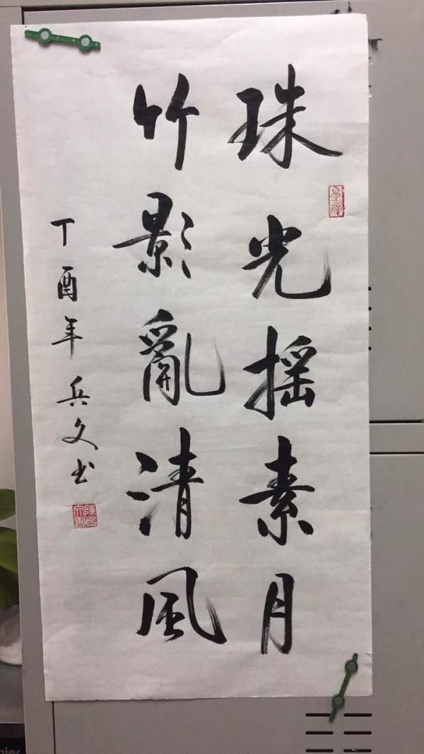 陈兵文,自幼练习书法,师从中国美术馆馆员中国书法家协会会员韩卫国、临摹欧阳询九成宫碑、启功先生行书至今,现为中国国际工艺美术师协会会员、中国教育书法协会会员、中国文化名人网会员、中国国际书法家协会会员。作品参加过今年抗日战争胜利七十周年纪念活动、启功杯书法比赛等多次活动并获奖。
