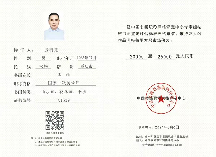 滕明亮,齐白石再传弟子,画风师承国画大家李可染。中国当代红色山水画家、国家一级美术师、国家一级书法家、中国中外文化交流艺术家、中华翰墨书画院常务理事、重庆印社书画组成员、中国书画家研究院创作院院长、九翰书院副院长、中华书画学会副主席、中国书法函授学院客座教授、中国书画家研究会副会长等职;主攻山水画创作,作品结构严谨格调高雅,被誉为中国国画山水、花鸟实力派画家。