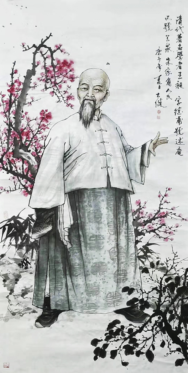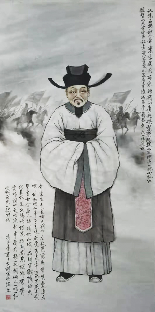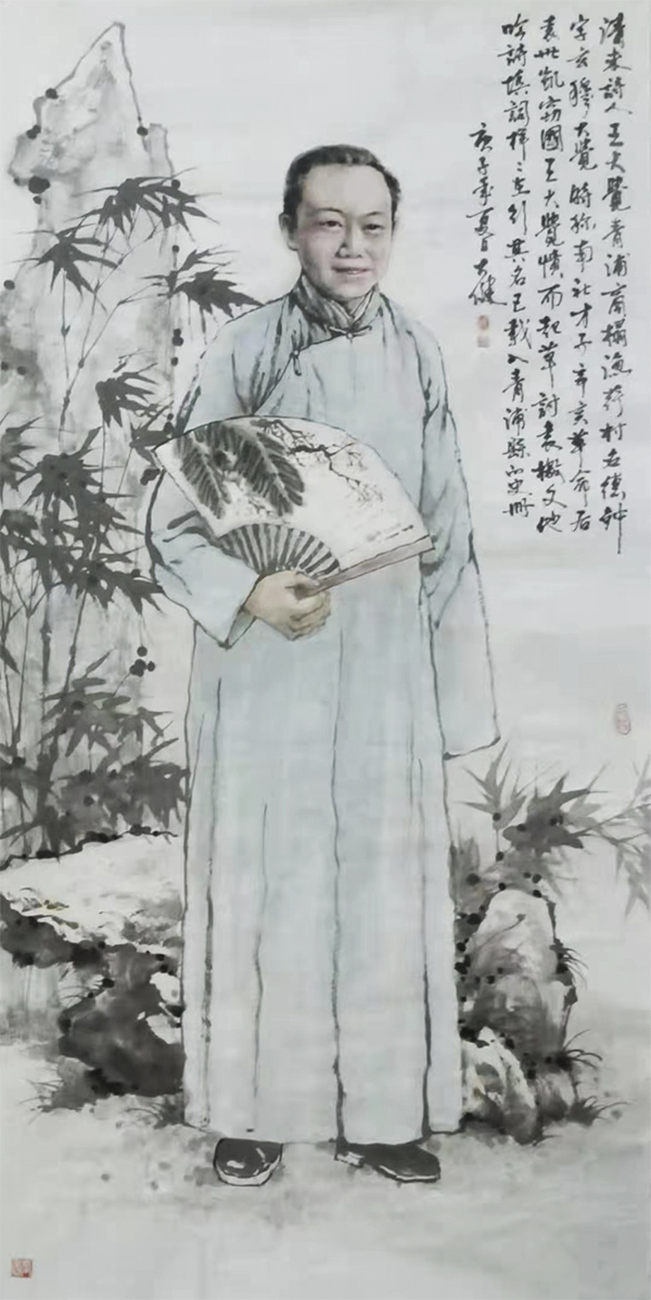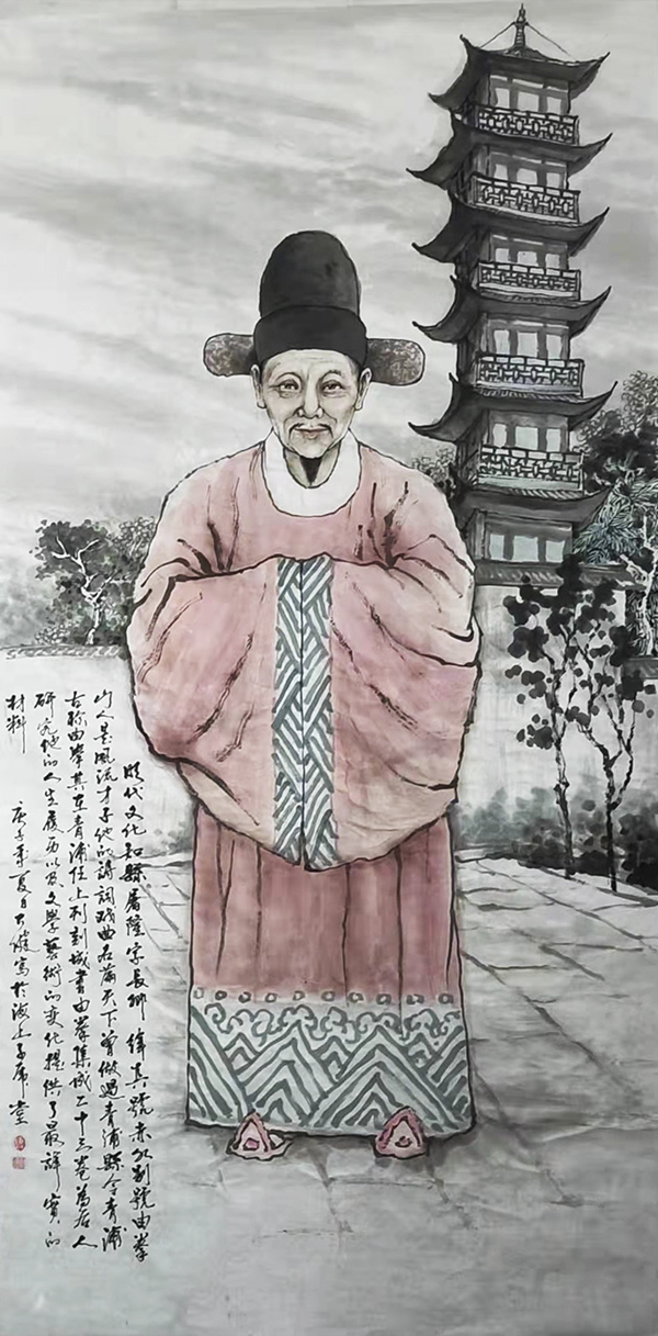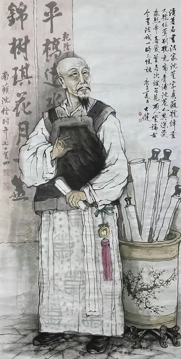 大健不是诗人,但是一位画家。一次,他对我说:疫情期,我画了二十幅青浦历史人物。我听后很惊讶。创作这些历史人物不能胡编滥造,还要自己去搜集人物图片的参考资料,仅仅从网上搜集,是收集不全的。况且,要画了一组,意味着是一个系列的,表现一个主题的水墨画,场面相对比较广阔,讲究作品主题的完整性和一致性。没有坚强的毅力,恐怕是难以完成的。组画,表现时能够摆脱色彩、元素、线条、构图等元素限制,尽情发挥的绘画方式,这又非常符合大健老师率真而豪放的性格。