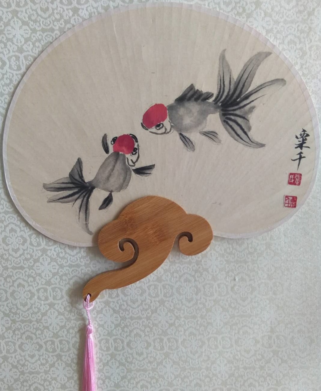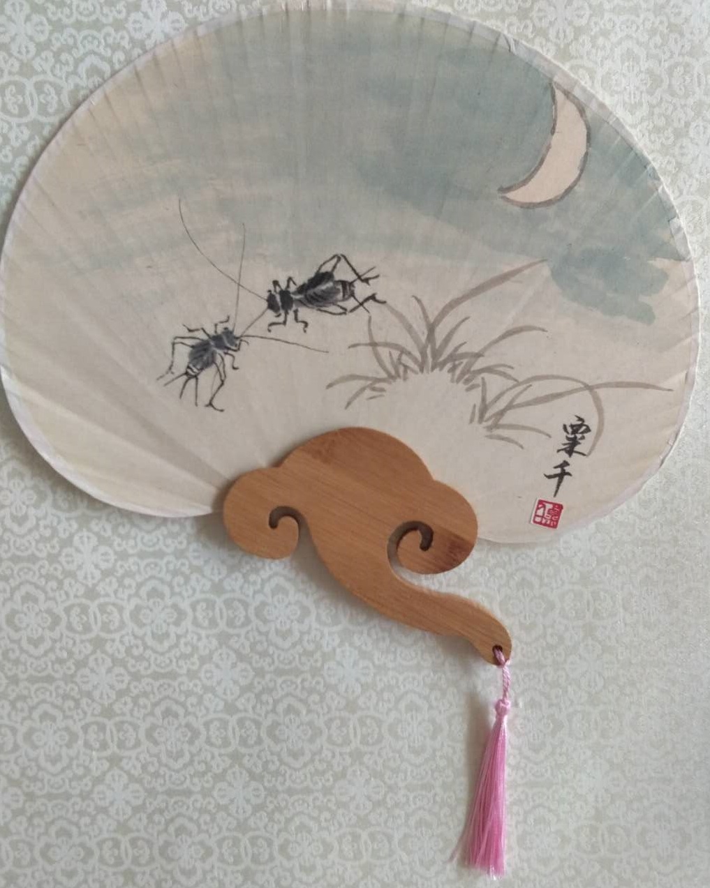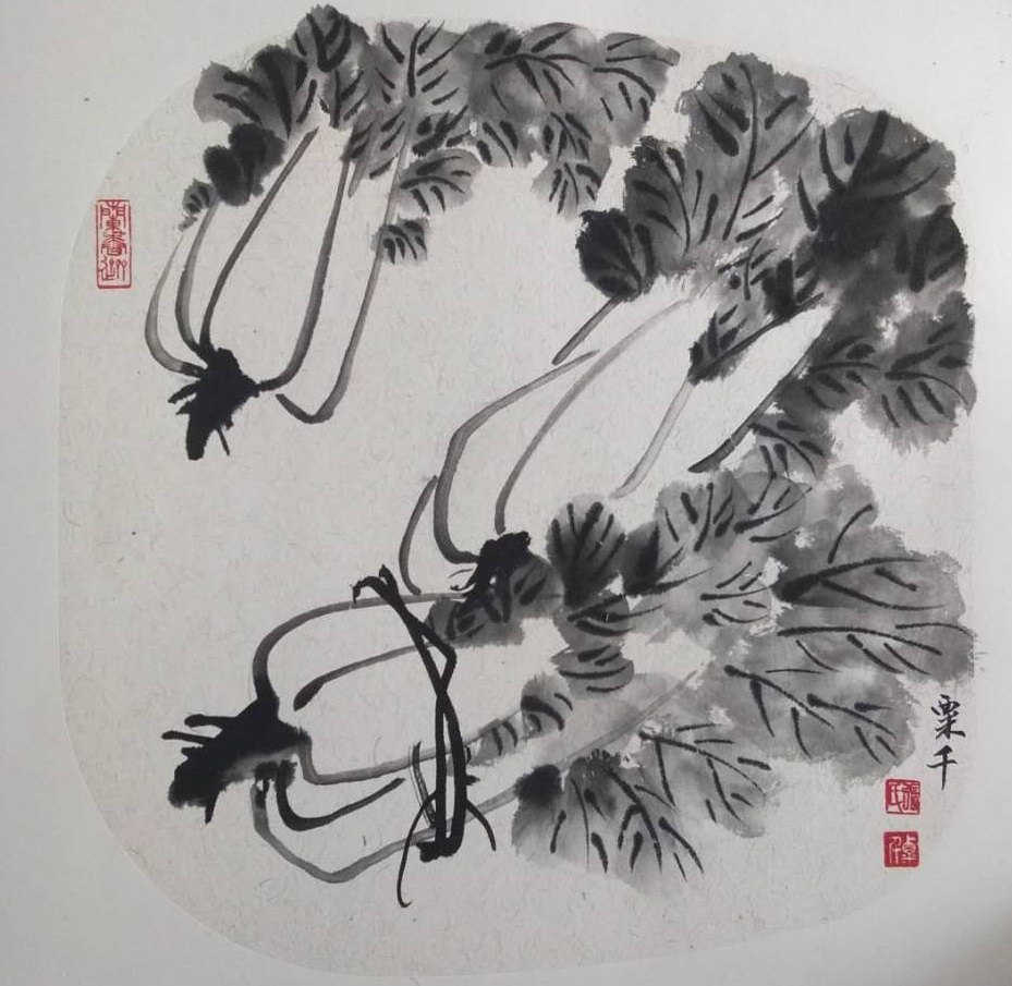 说到这里,我就得谈谈她画的意境。她的画不是简单的花鸟,而是每一件都想告诉我们一些生活的什么,贵重的不是金钱,也不是权力,而是生活的自由和品质的高洁。譬如:《淡泊》装在花瓶中的荷花,洁白无瑕,但瓶却不是顿在居室之中,而是顿在野地,更为奇怪的是却有花瓣掉落,枝叶在地,叶片上还有蜗牛,不紧不慢不骄不躁地爬着。这一切在告诉我们,高洁的莲花被人们折去插在花瓶中,那不是爱花,而是一种伤害,所以掉落了花瓣,花瓶顿在野地,那是一种回归自然的希望,所以蜗牛爬在叶上,透露的仍然是自然的信息,一切只有回归自然,才能得到真正的幸福。同时,也从另外一个角度告诉我们,要珍惜眼前,圣洁的莲花被折插花瓶,已经掉落一些花瓣,蜗牛爬上残叶,被人遗忘在野地,尚且保持它的洁白无瑕尽情绽放,我们有何不能理解生活的无奈和无边无际的艰辛,我们得到的自由和我们敢爱敢恨的思想就是幸福。再来说《困惑》,画面中只画了一个鸟笼挂在绳上,一只鸟飞来看望鸟笼内的鸟,仿若窃窃私语,又仿若是在问候,下方则留出大面积的空白。是的,笼外的鸟不理解关在笼内的黄莺,尽管婉转百鸣,那是一种不自由的生活,同样笼内的鸟也不理解笼外鸟,衣来伸手饭来张口的生活不过,却要去那么辛苦的奋斗,由此,让我想到钱钟书的《围城》,人生本来就是围城,笼外的想进入笼内去,笼内的想冲出来,或者是两种根本就不相互理解,一个对一个排斥,世事万物自有规律,不理解则生困惑,困惑源于心,心静则平。《恬淡无人见》也是一幅很有生活哲理的画作,生活本来就是萝卜茄子油盐酱醋茶的生活,画面中只画了萝卜、茄子、竹笋、藕和莲蓬几种静物,充满了生活况味,每天上上班,然后买买蔬菜,做做饭,与家人一起品尝家宴,看起来生活平淡,但是却充满了知足。平淡是真,淡泊无求,人生际遇在于自我,心灵高洁淡泊也是一种幸福。另外,《寂寞开无主》中藤萝繁花盛开,蛐蛐却有离开之意,《富贵花期若早来》中牡丹盛开,虽有蝴蝶光顾,却毕竟是插在瓶中之花,即将凋谢,都有着淡淡的愁怨。《夜阑风静得香迟》画得细腻,花冠硕大,但毕竟是在夜中,待发现的时候,也是很晚了;《无处著清香》则是一株狂放的牡丹,浓香袭人,单只蝴蝶近身,形成了强烈的反差,身在这个经济社会,艳俗到处都是,要得一点清香何其艰难?画之生活领悟暗藏其中了,我们求的其实只是简简单单的生活,哲理在淡泊中无限放大。