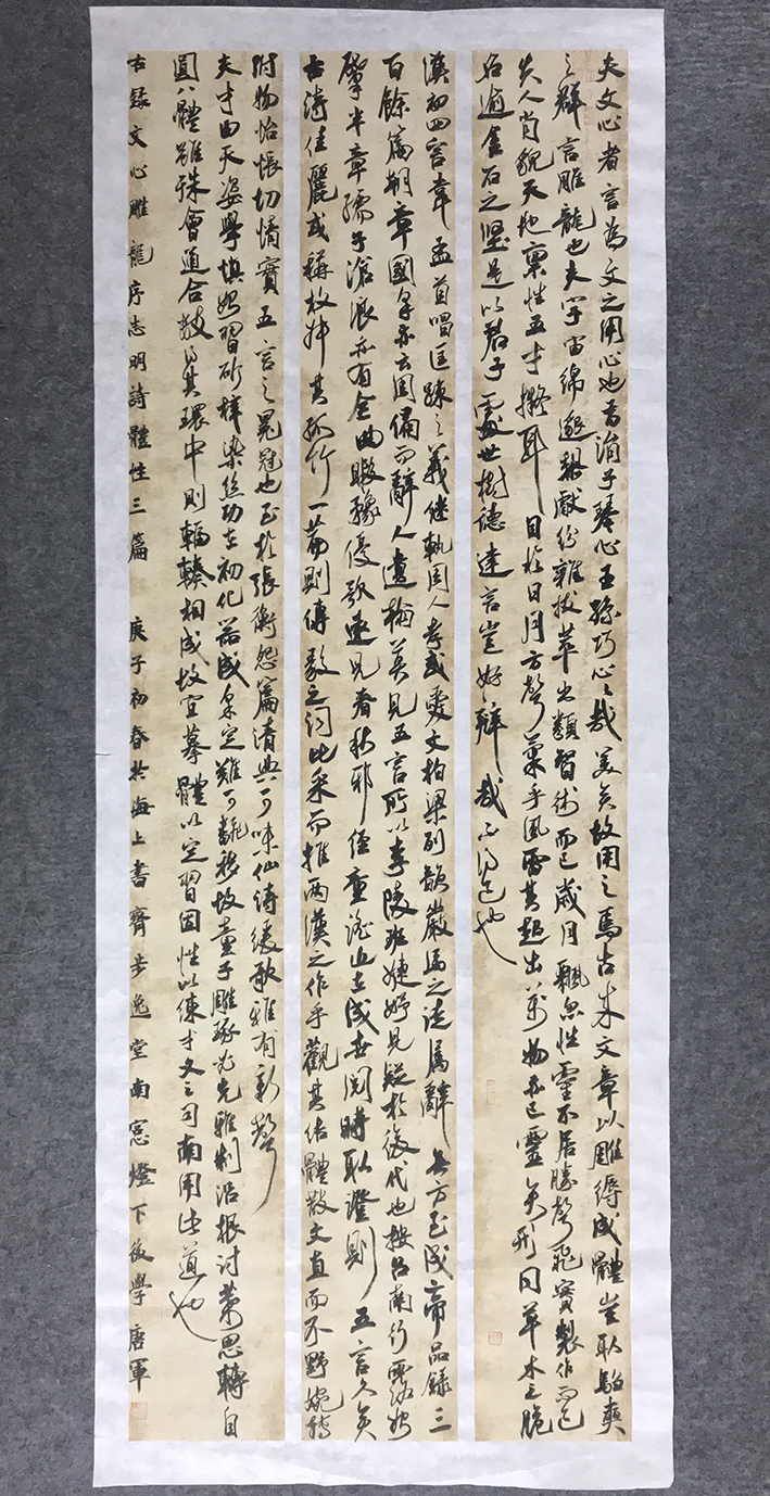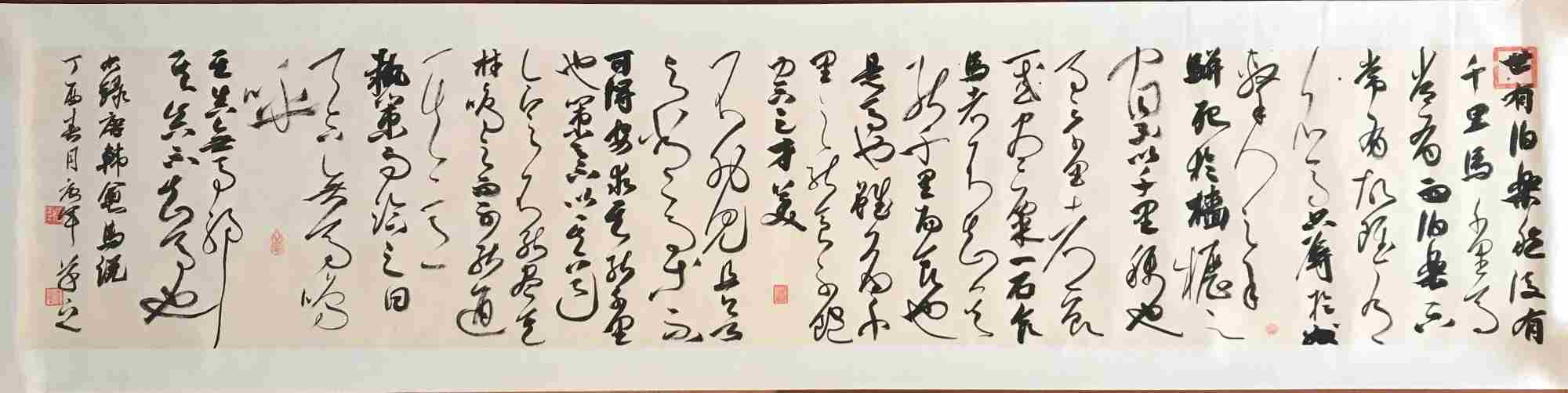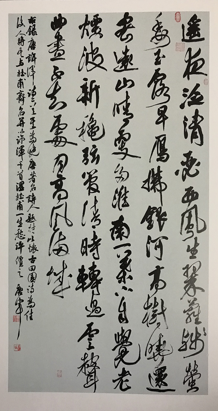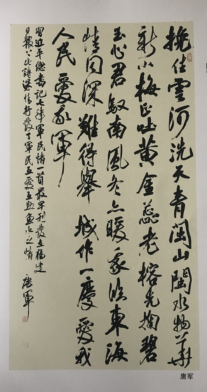 唐军,字继东。步逸堂主。南樵居士。居住上海市闵行。喜欢中国传统文化诗词歌赋。自幼习颜楷,欧楷。于二王、颜鲁公,欧阳率更、米南宫、祝枝山用心临摹。尤喜小王草书,倾情着力于怀素、山谷、傅山、王铎技法!后受教于众方家,转益多师,受益良多。