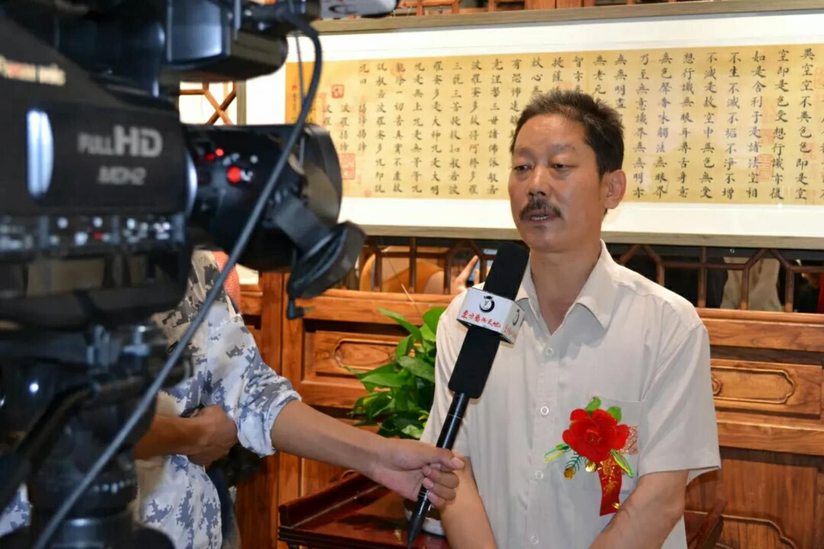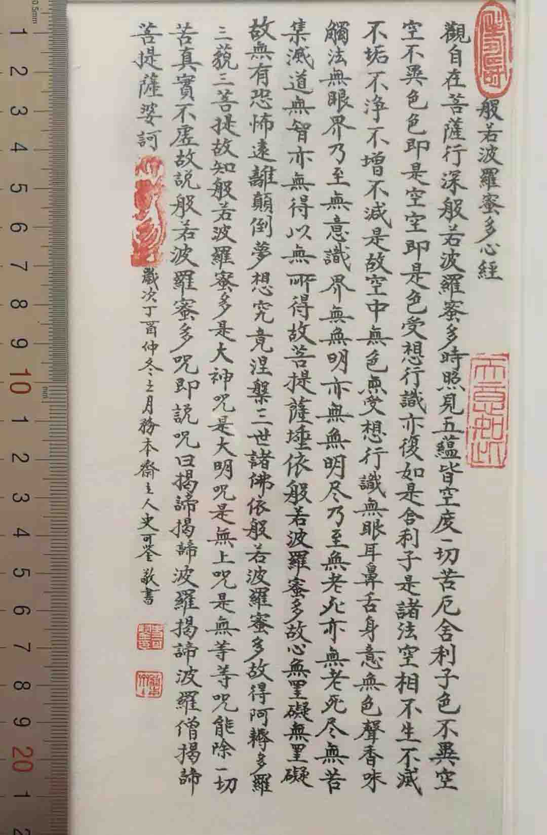 史可鉴的小楷经文,那份静气让人仰慕,尤其是现代社会科技发展的高速度与时代的躁动,更令人产生一种向往。那种线条的舒张,那种缓和、张扬,读来气为之顺。现场书写时他的那种自信和张扬、谦虚和厚道,一招一式,似乎就是在跳舞、在弹琴、在唱歌、在踏泥泞、在走山路。史可鉴先生告诉我们:《般若波罗蜜多心经》正文260字核桃楷抄写了不低于500遍,不包括被买断经营的200卷,《金刚般若波罗蜜经》正文5458字,《道德经》正文5301字,《地藏经》、《楞严经》、《洛神赋》、《岳阳楼记》等等名文大经,每篇多少字,脱口就来,足见他对这些经文的熟悉。抄过的经文数也数不过来,都是用的小楷或核桃楷,一笔一划,规规矩矩地写,多数都是在夜深人静时完成的。小楷需要静心,经文不可错字,不可多字,不可漏字,没有耐心写不了。“抄经文需要虔诚,需要认真、仔细,抄经文,学古人,那份感觉,那种体悟,那种高度,诸多事例在现实生活中也常见,甚而比古人见到的层次更高,更感人,但经文中的文字经典、优美,的确一字不可易。”史可鉴如是说。