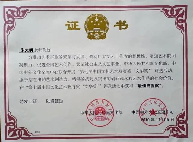 2010年中华人民共和国文化部第七届中国文化艺术政府奖文华奖评选活动,朱大明获得“最佳成就奖”。