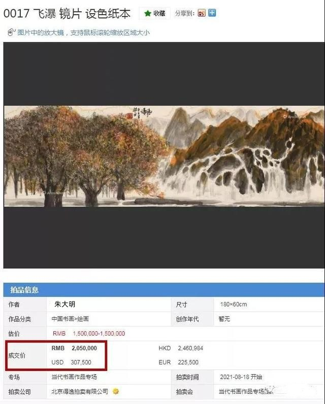 2021年 朱大明《飞瀑》拍卖到2050000元