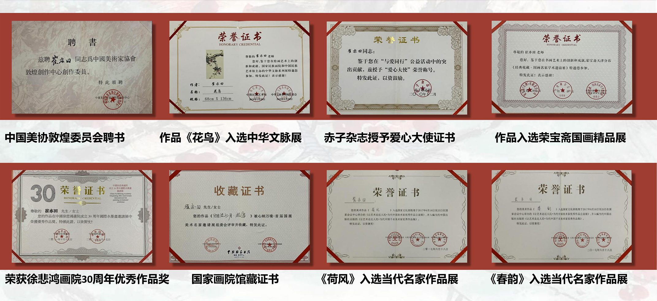 ·2017年崔亦田作品《春韵》《荷风》入选《让艺术走近人民当代中国美术家优秀作品公益展》,并入编当代中国出版社出版的(让艺术走近人民.当代中国千名美术家优秀作品集》