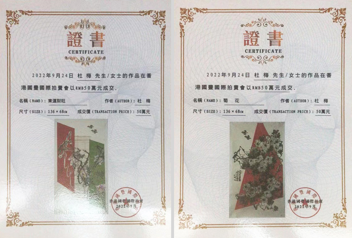 作品《东运财旺》《菊花》在2022雅昌香港国丰国际拍卖会上分别以50万元成功拍出
