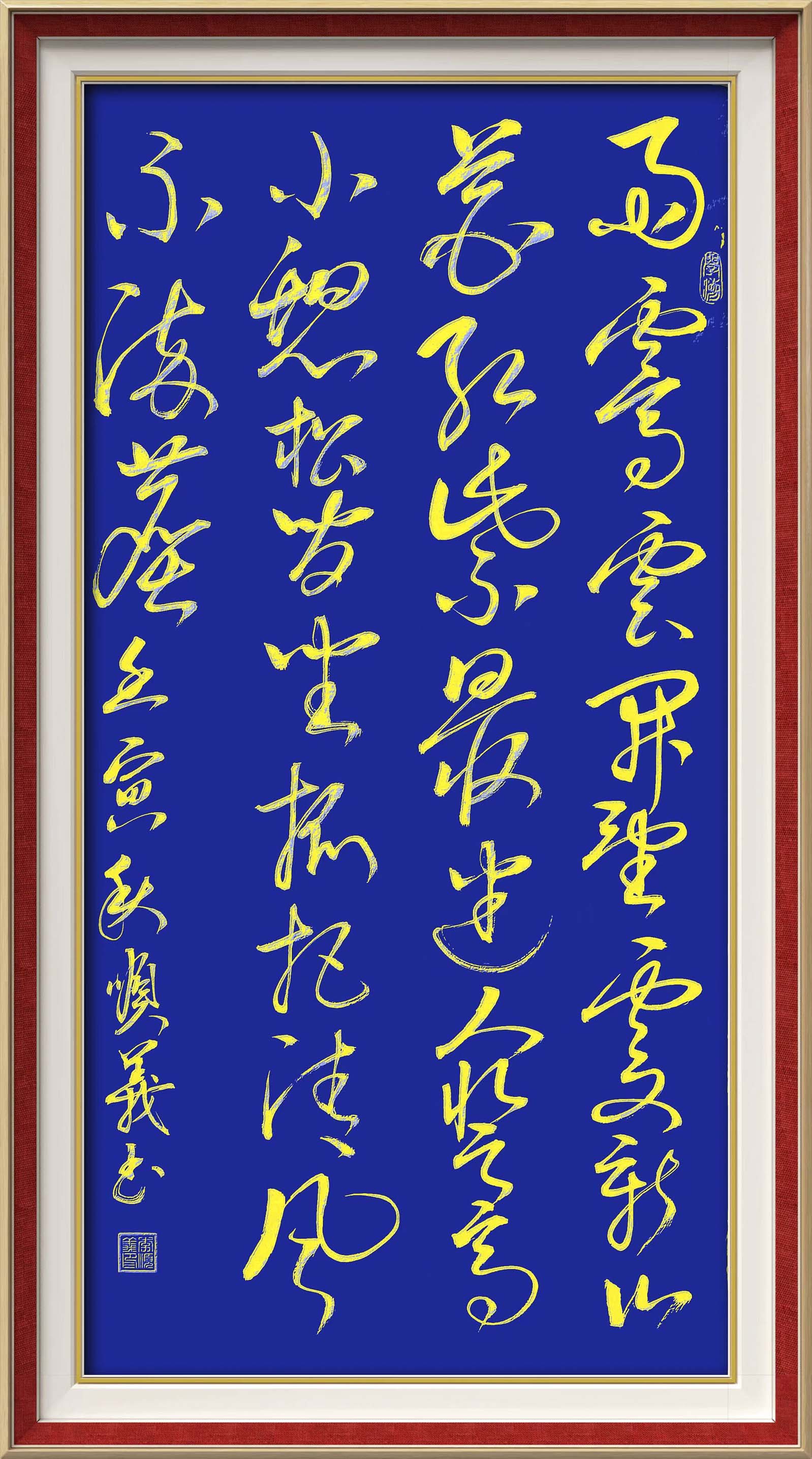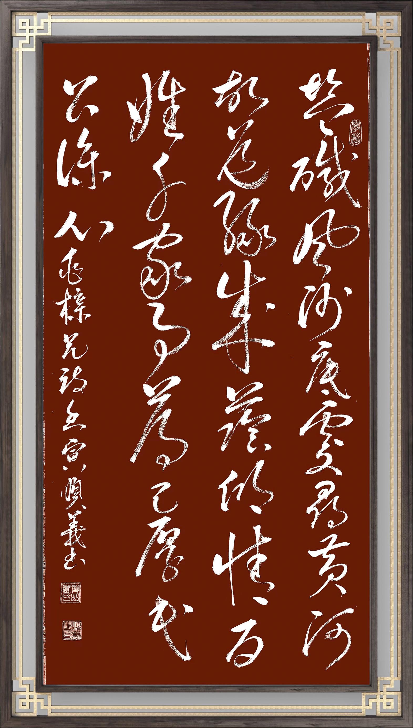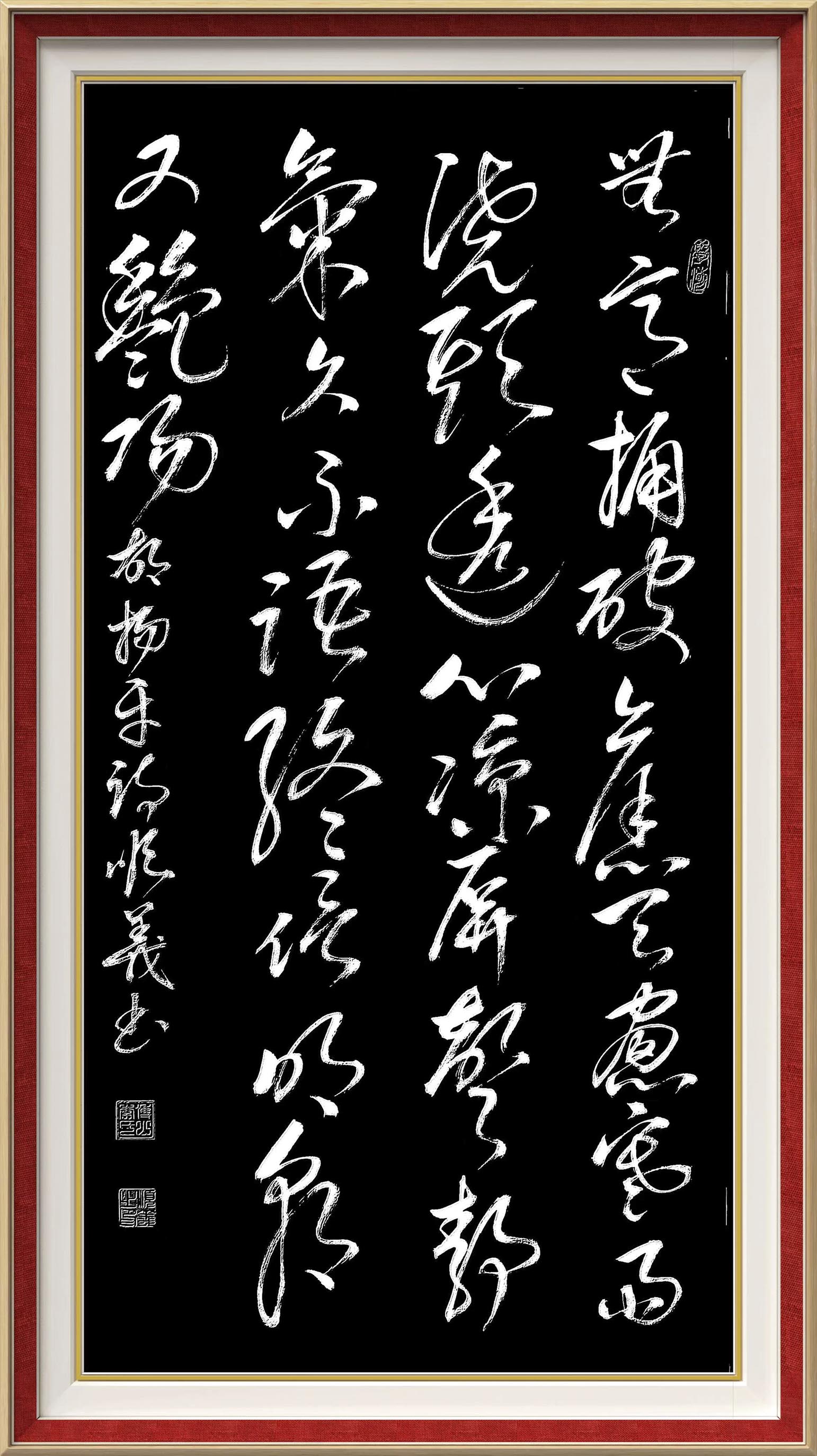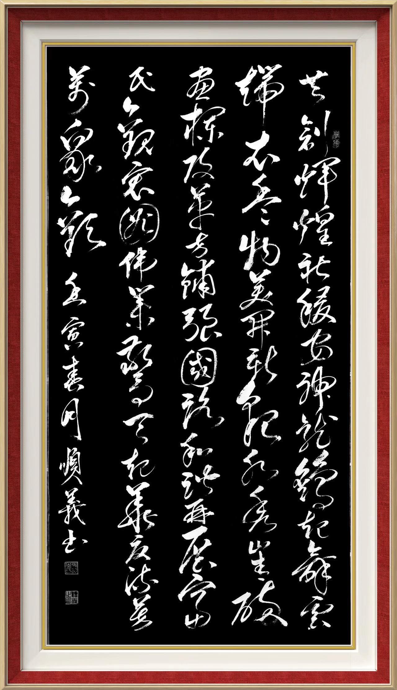 李顺义之书法,除了有力透纸背的千钧力道,也有因气蓄势的千变万化。如果书法只有力,没有势,难免呆板。只有势无有力必是浮滑。他的笔力可凌空杀纸,作力透纸背的表达遂心应手,又可以意在笔先,因气铺陈笔墨,气凝为势,笔未到气已吞,势来不可止,势去不可遏!上下翻飞写动态,临危居高作势态,动与势相互转换,可以把行草作品写得左蹙右盼如惊电,状如楚汉相攻战!横如布阵排云,牵似万岁枯藤!