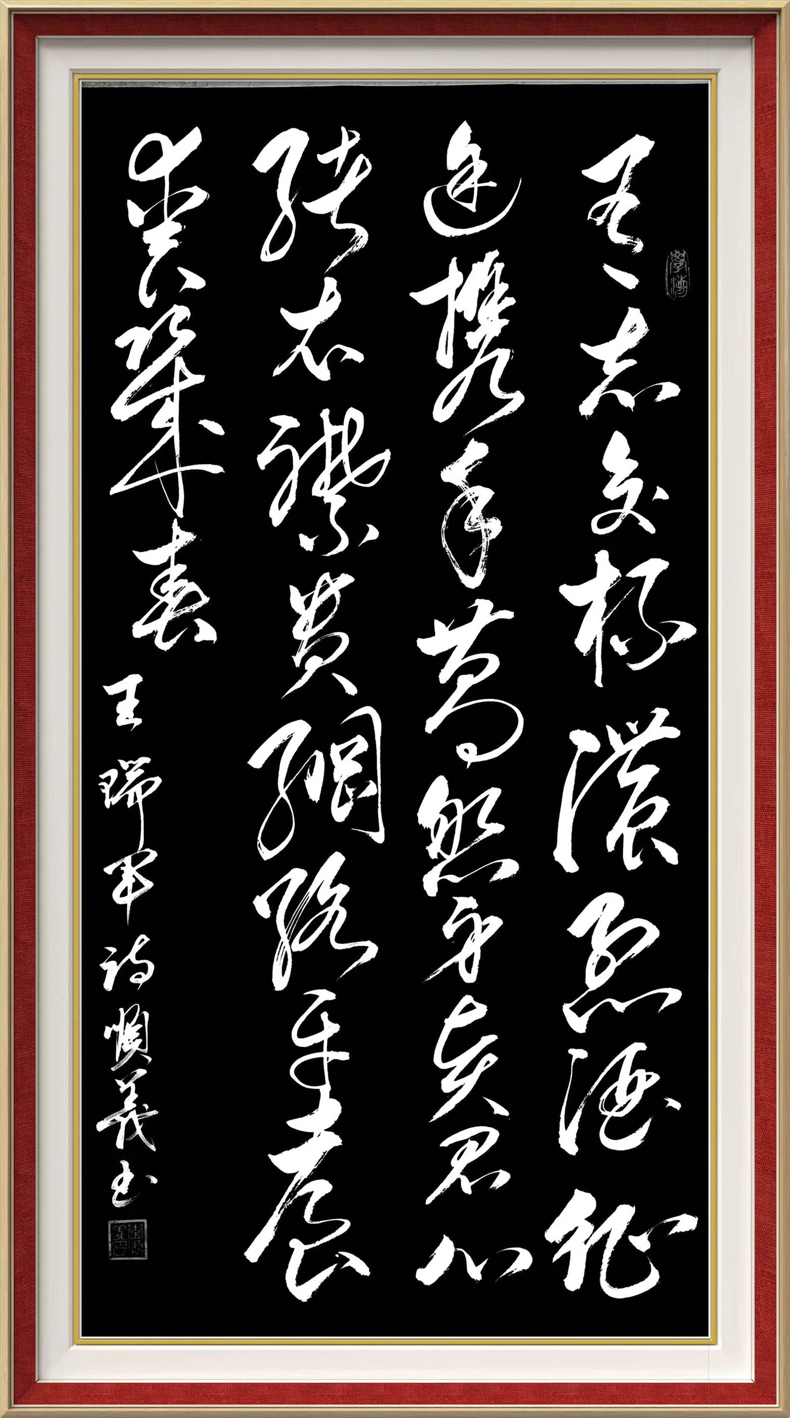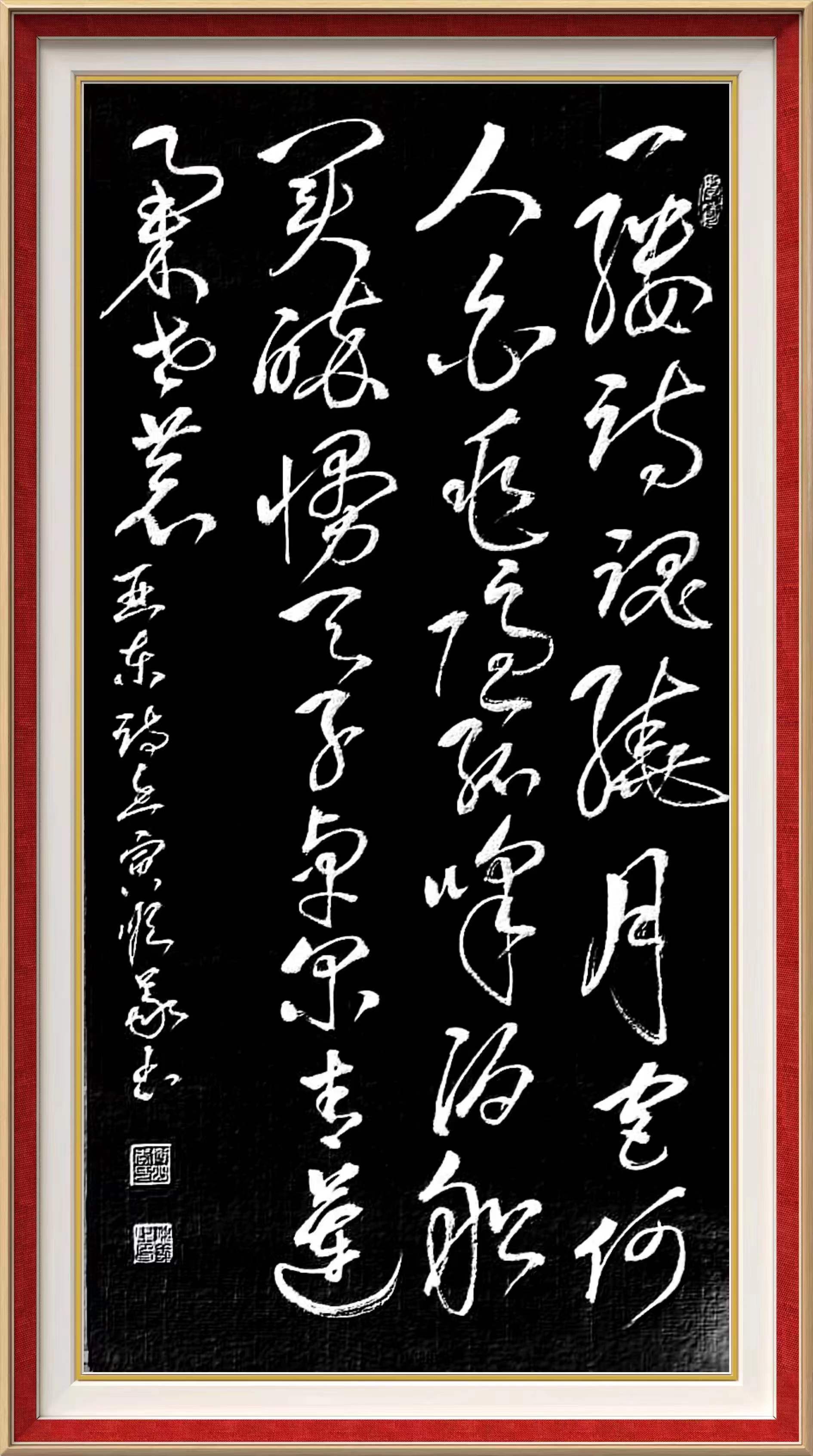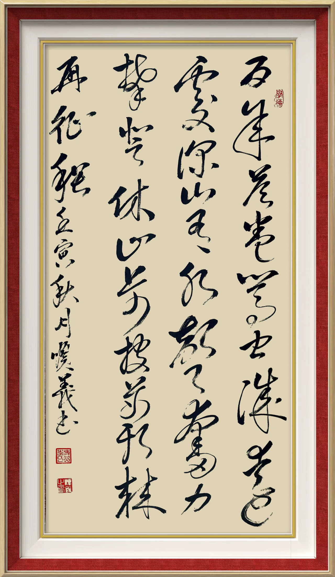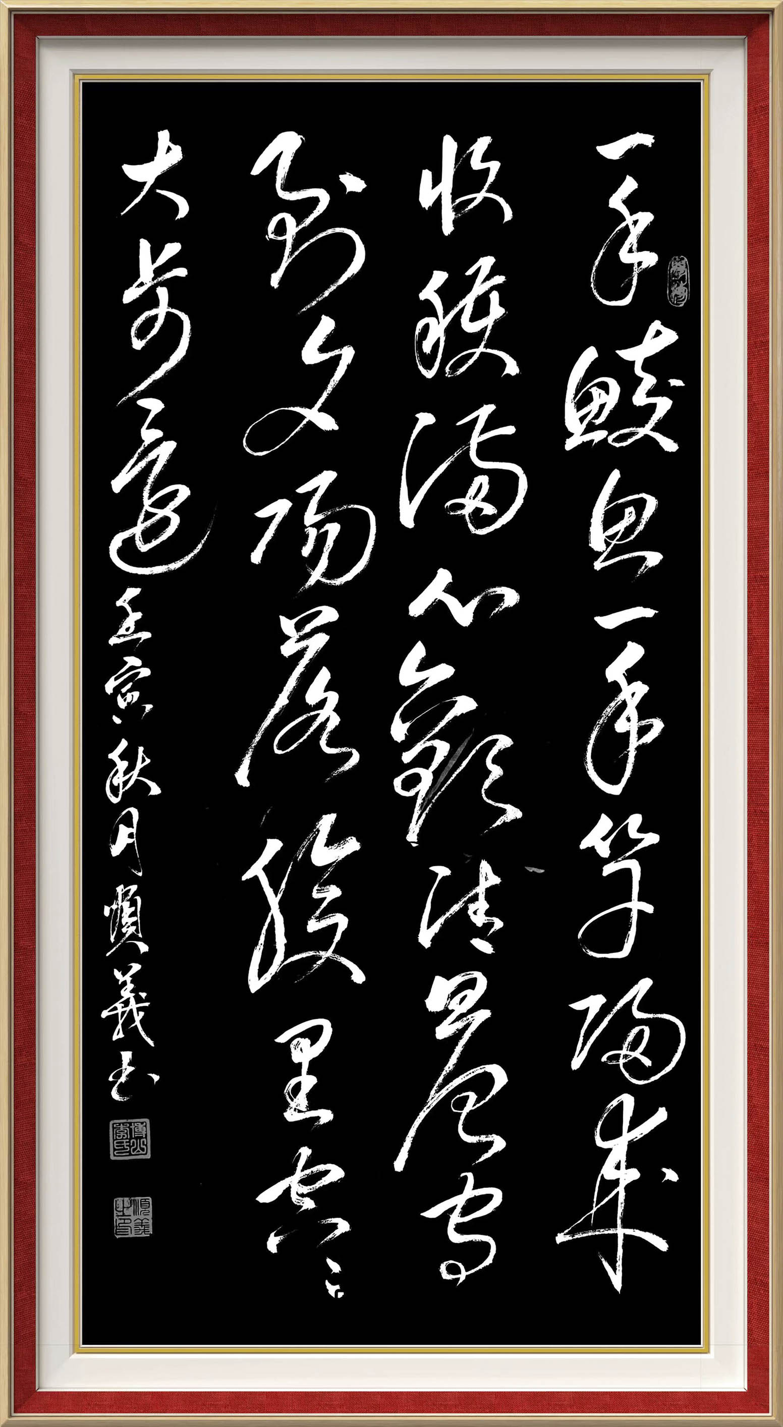 李顺义之书法,除了有力透纸背的千钧力道,也有因气蓄势的千变万化。如果书法只有力,没有势,难免呆板。只有势无有力必是浮滑。他的笔力可凌空杀纸,作力透纸背的表达遂心应手,又可以意在笔先,因气铺陈笔墨,气凝为势,笔未到气已吞,势来不可止,势去不可遏!上下翻飞写动态,临危居高作势态,动与势相互转换,可以把行草作品写得左蹙右盼如惊电,状如楚汉相攻战!横如布阵排云,牵似万岁枯藤!