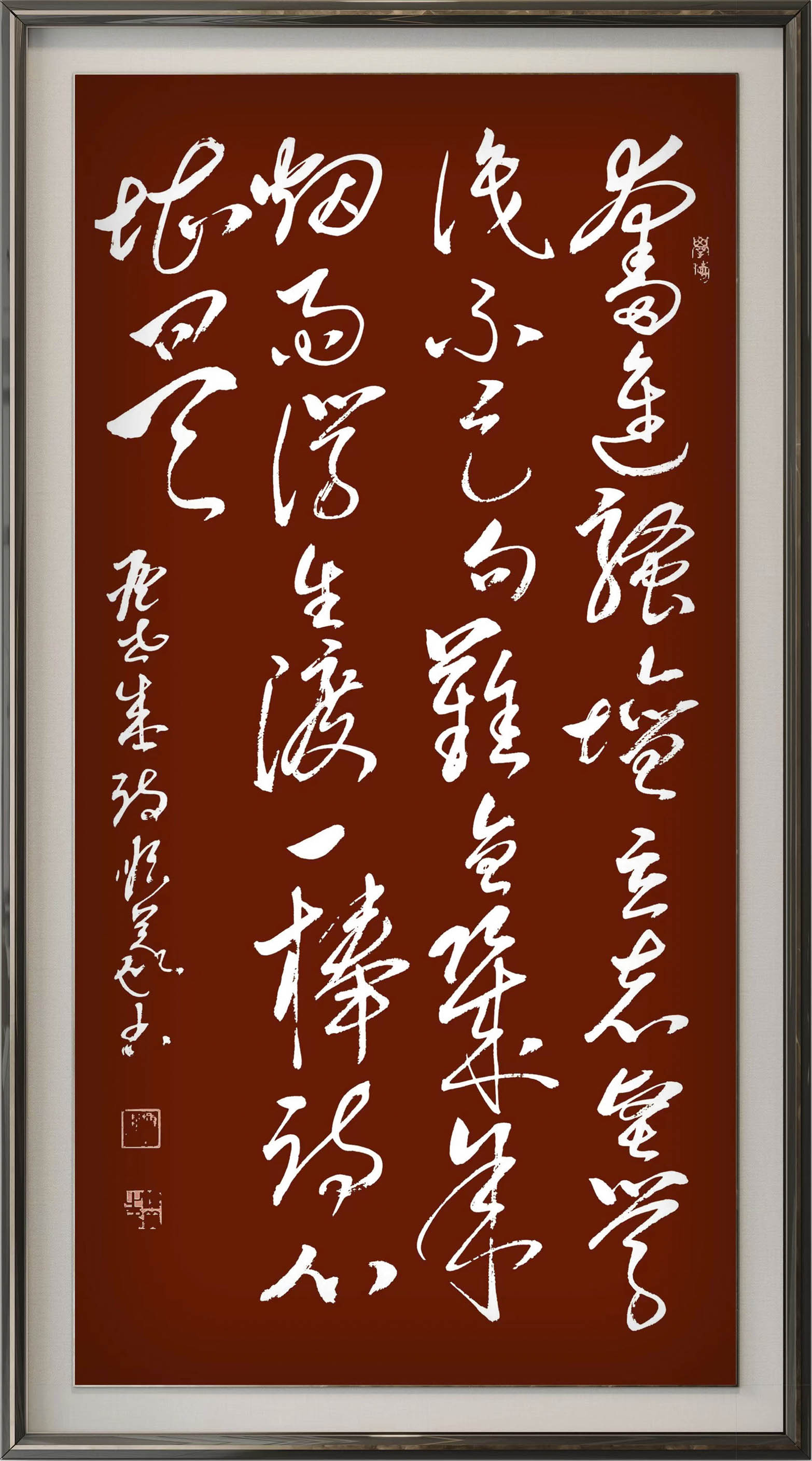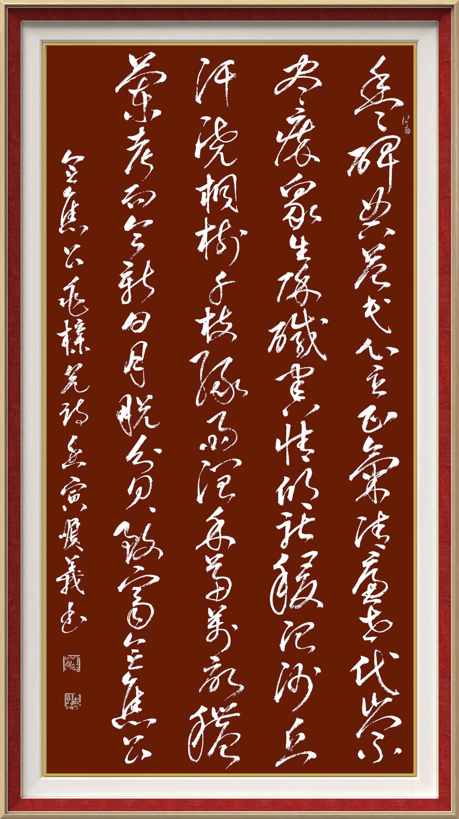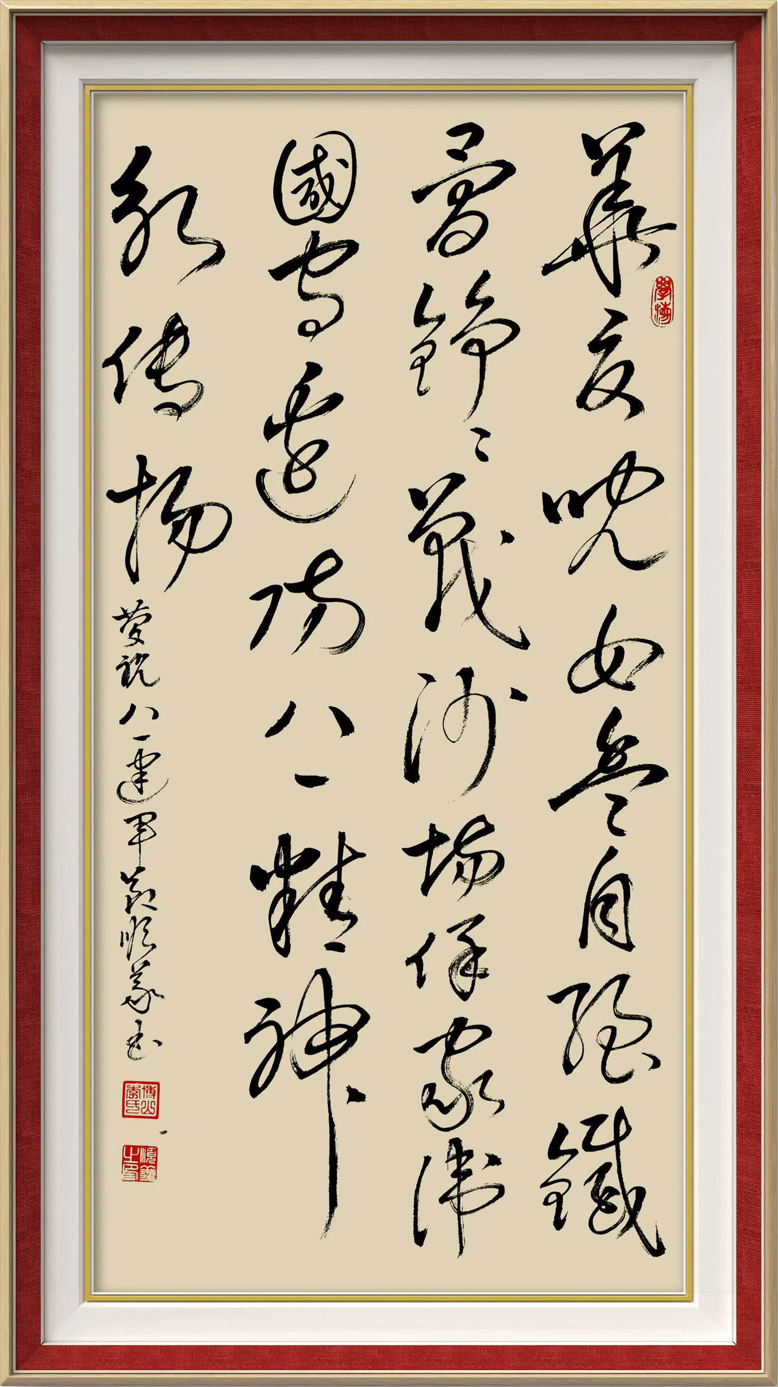 其作品纵横飘逸、含文包质、技法娴熟、结字宽舒、气势奔放、节奏鲜明大气磅礴,作品被各界人士悬挂和收藏。
