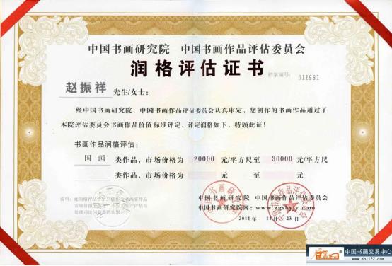 2011年经中国书画研究院、中国书画作品评估委员会评定赵振祥国画作品润格为人民币20000元-30000元/平方尺;
