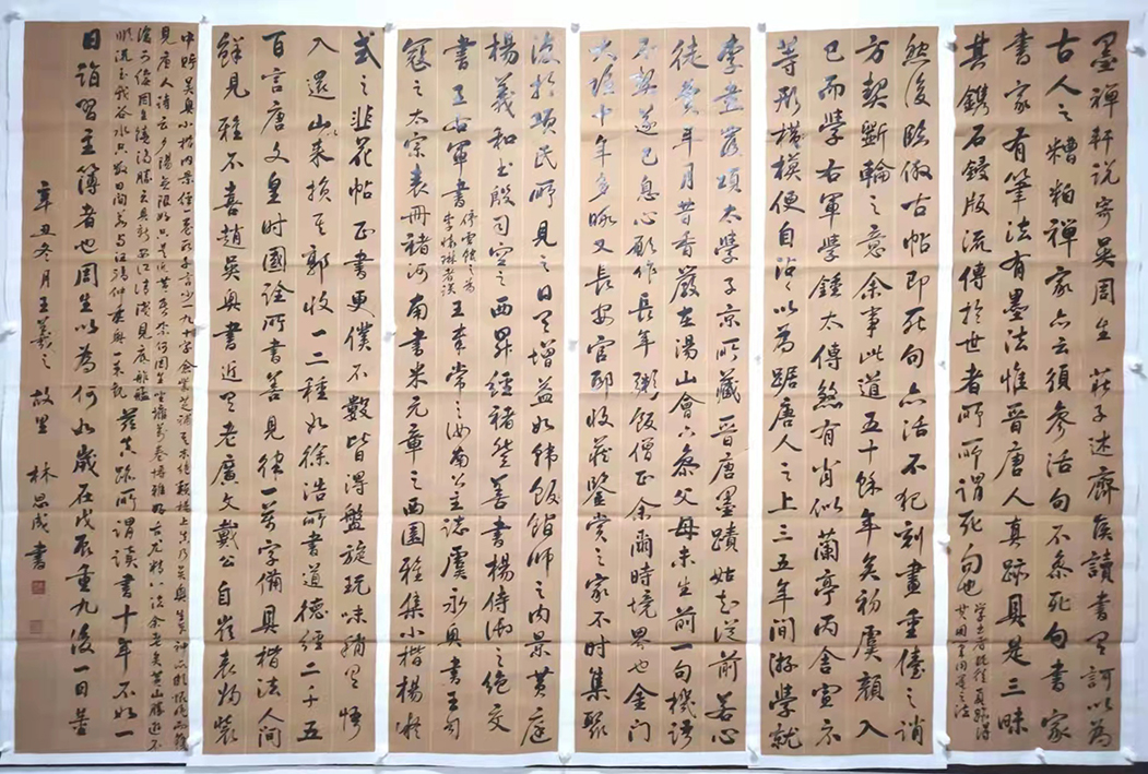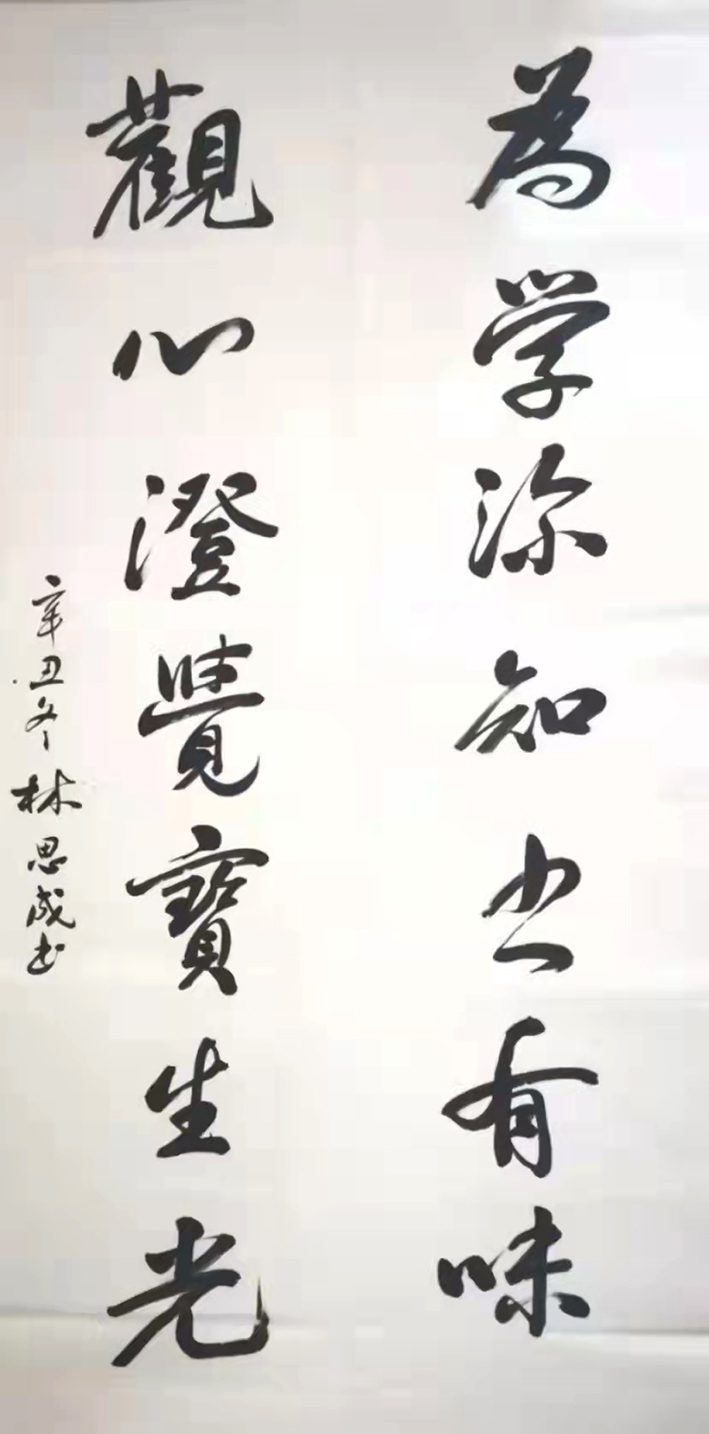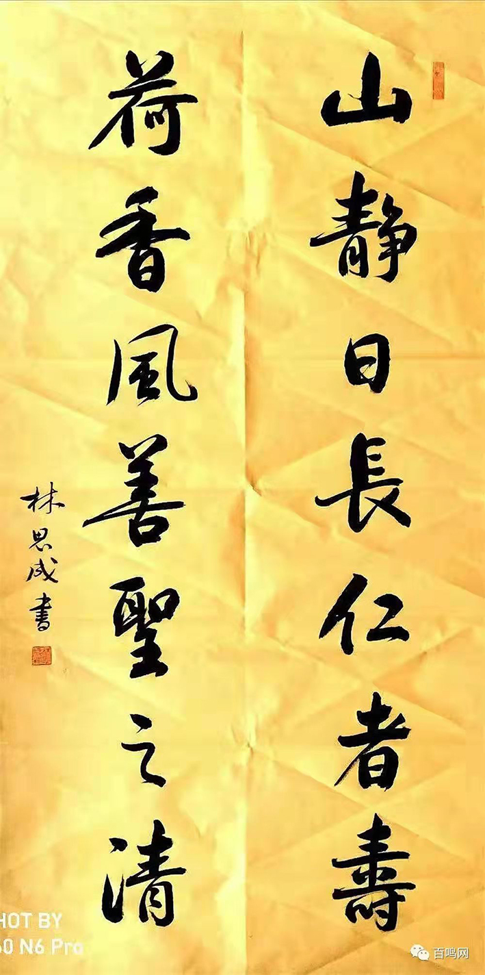 林思成,堂号荷塘书屋主人,1949年生于临沂河东区。多年来作品在全国多次奖,积极参与国内外书艺交流。幼承家教,喜爱书法,几十年遍游名山胜水,搜罗名碑法帖,临摹名家碑帖。书法以二王、米、董见长。闲暇时间,创作诗 词。以诗书会友,翰墨怡情。书法作品被美、韩、马,日等国家及港澳台地区友人 和知名收藏机构收藏。曾获文化部在香港举办的世界华人书法展三等奖……。自 言:“书道崎岖滋味长,不必沽名钓文章。赢得百姓一片喜,笑取果蔬半篮 香。”