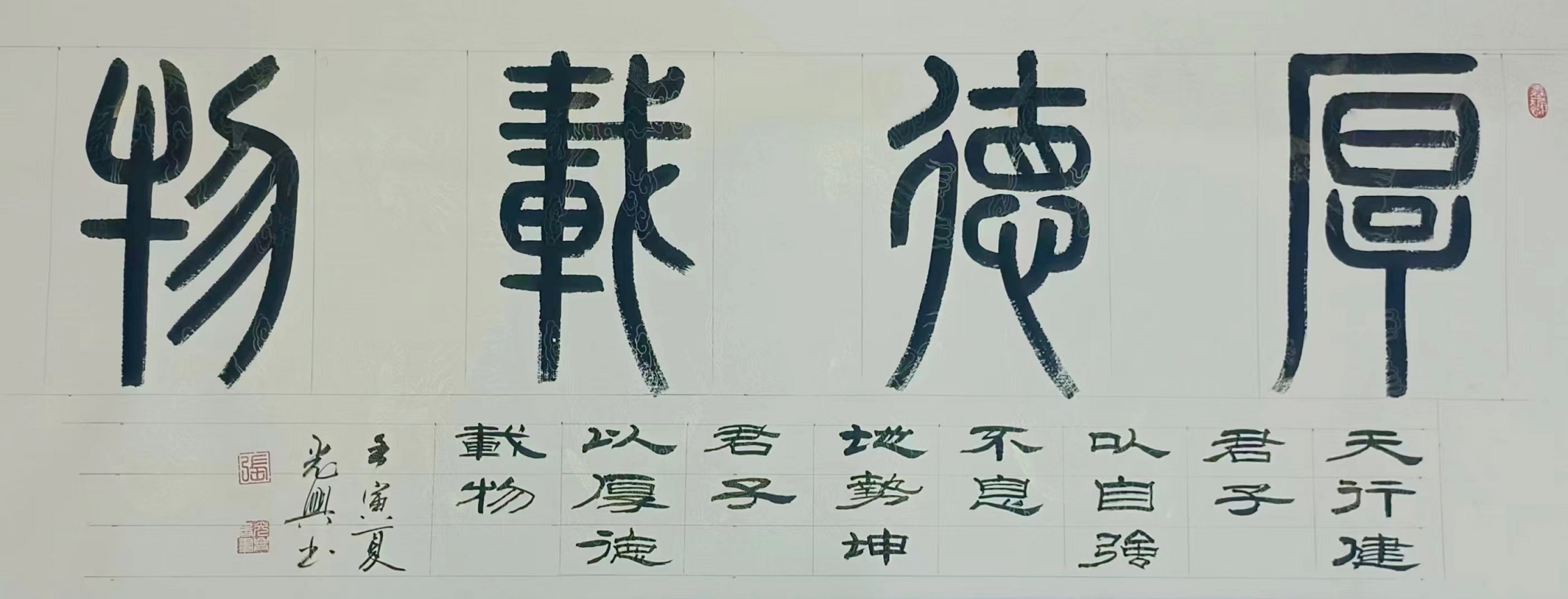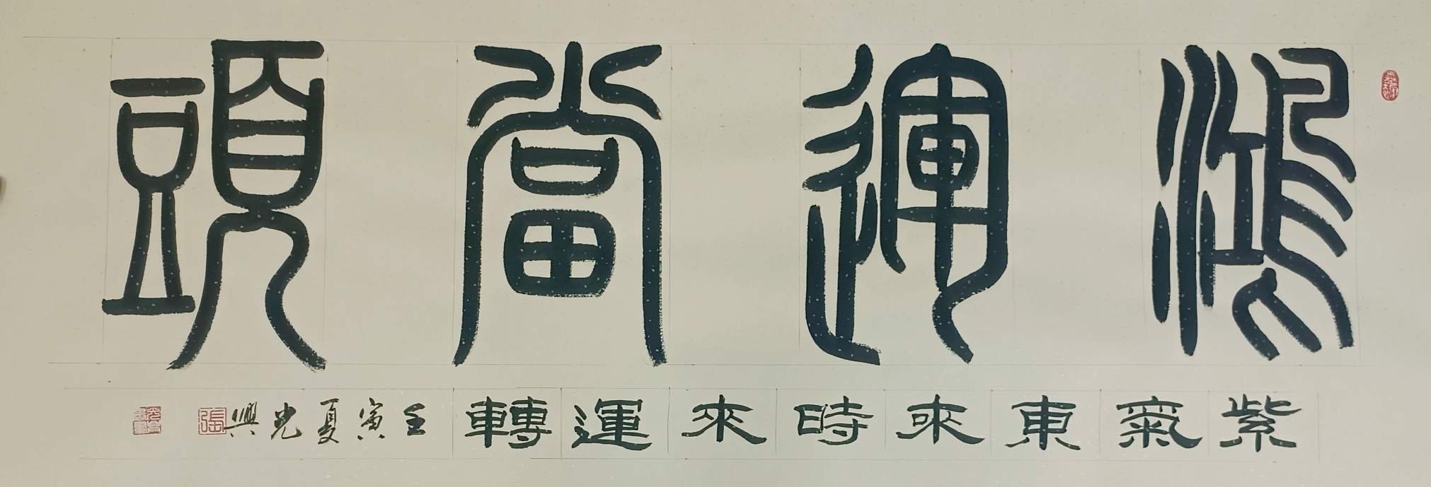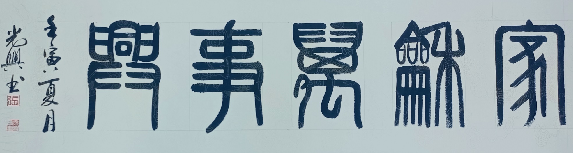 张光兴书法造诣同样很高,1980年后,张光兴开始学颜柳,后研习二王,数十年临池不辍,尤擅篆隶,后因对于八破图的研究参加考古,张光兴对于原始甲片中的象形字也很有研究,博采众家之精华,揉自家之底蕴,其作品书法笔峰或委婉用贴学笔法,或苍劲用金石笔法,呈豪放苍劲,古朴雄强之气象,50岁后更是创立了一种个人风格强烈的篆体;展现出娴熟的艺术功力,彰显出非凡的艺术风格,颇具大家风范,也是当代少有的书画双绝的艺术家。