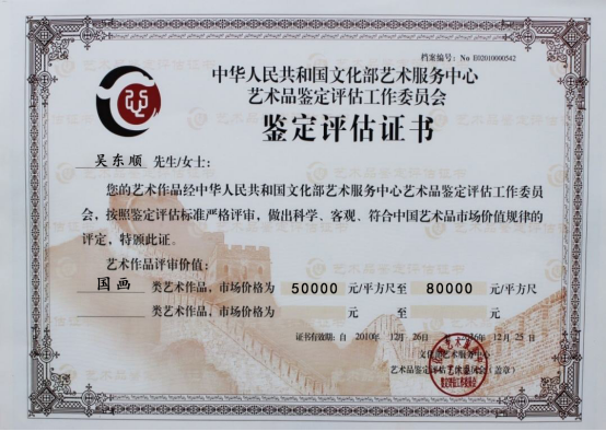 吴东顺书画作品的润格费被文化部文化市场艺术品评估委员会评定为50000 -80000元/平尺。