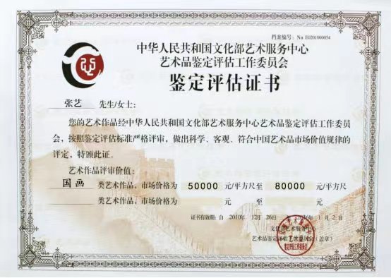 张艺书画作品的润格费被文化部文化市场艺术品评估委员会评定为50000 -80000元/平尺。