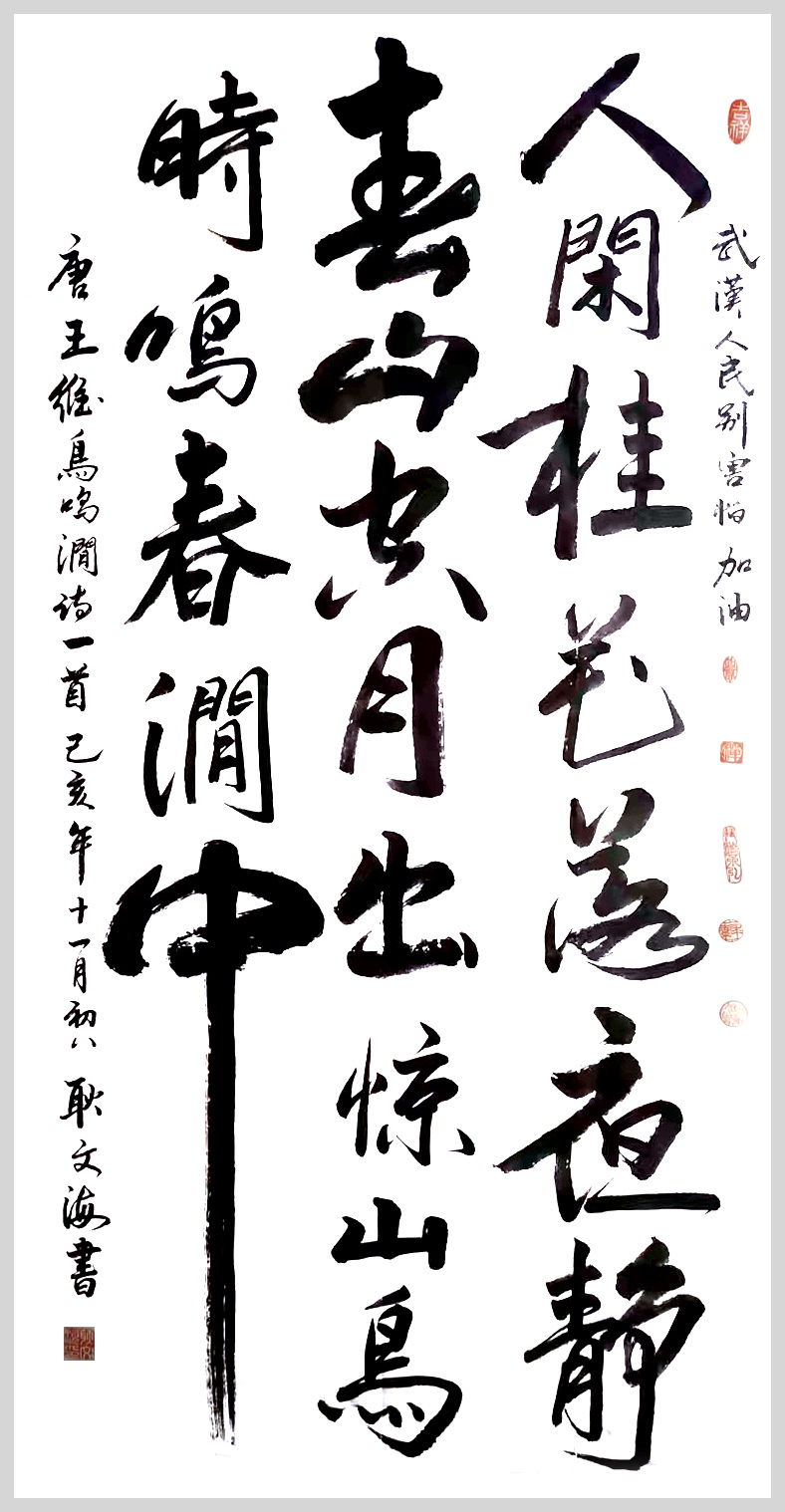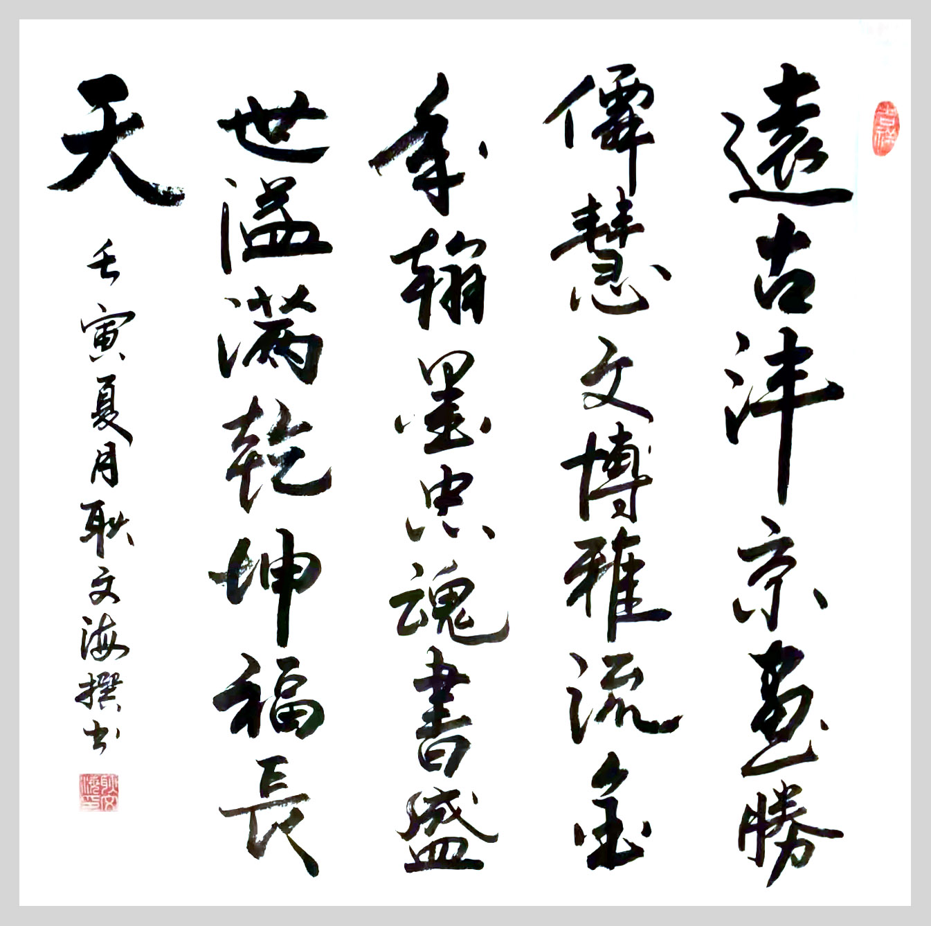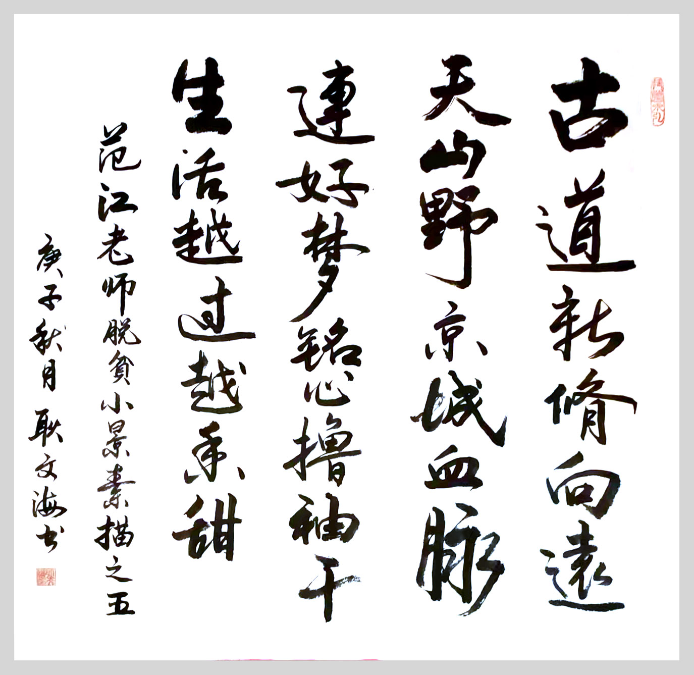 每每参与艺术峰会、艺术展览活动,及其他社会活动,耿文海总能融合他的诗词功夫,贴情合境地急就一章华美诗词,给活动展会带来意想不到的情景升腾和欢悦之质。耿文海的诗词能力,是许多展会活动的内核精华,总是文化的点睛之笔。现场吟诗,并不是耿文海文化行动的终止,吟诗过后,铺宣挥毫,将诗意融入飞墨,倾意而书,再为展会活动留下墨宝精品,以资会展史证和提升品质,往往赢得现场千般喝彩。文化是核心,作为文化人的耿文海,通常会成为各项活动的鲜明主核,以多才多能而卓显于人群之中,令人敬仰。