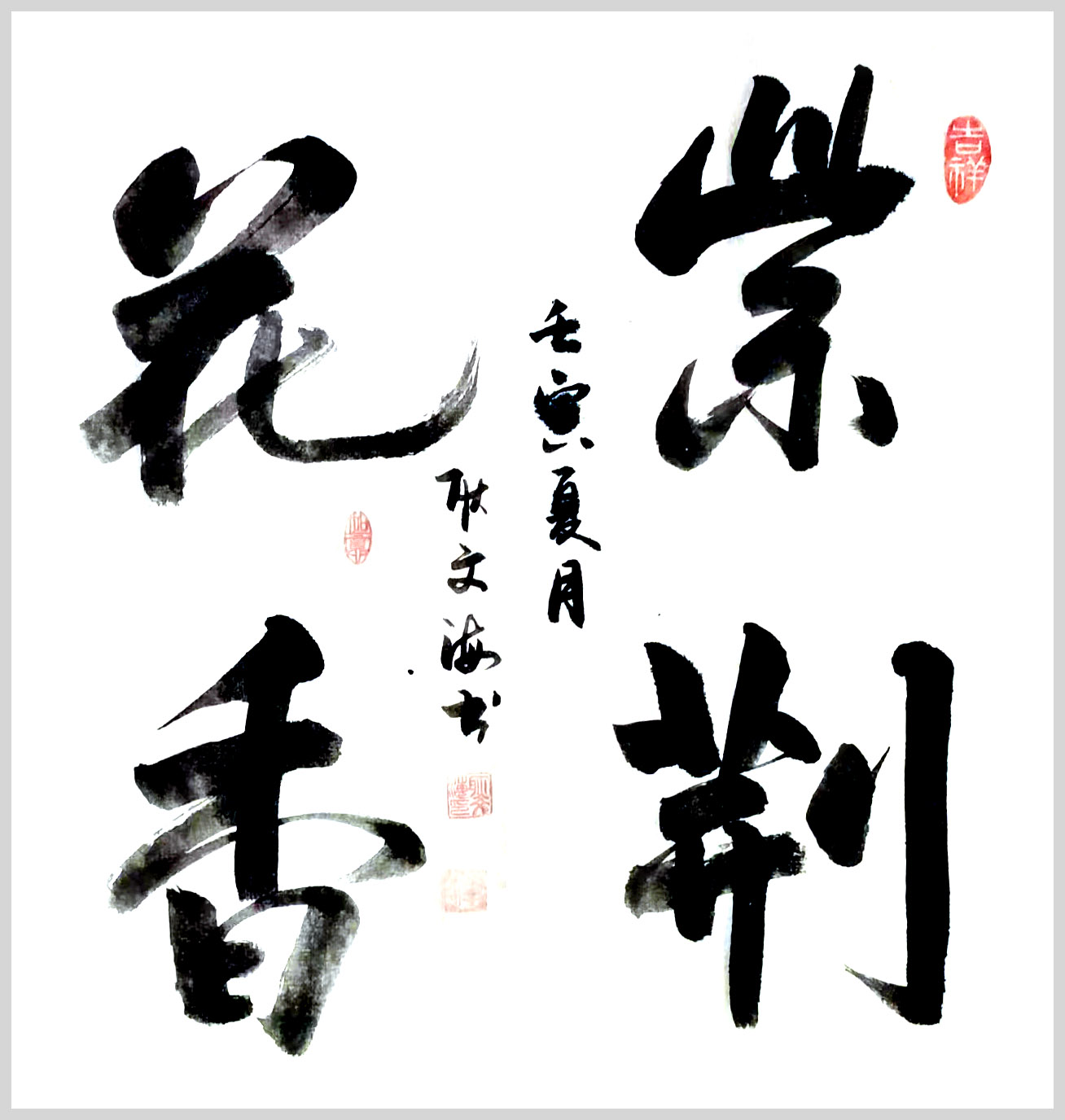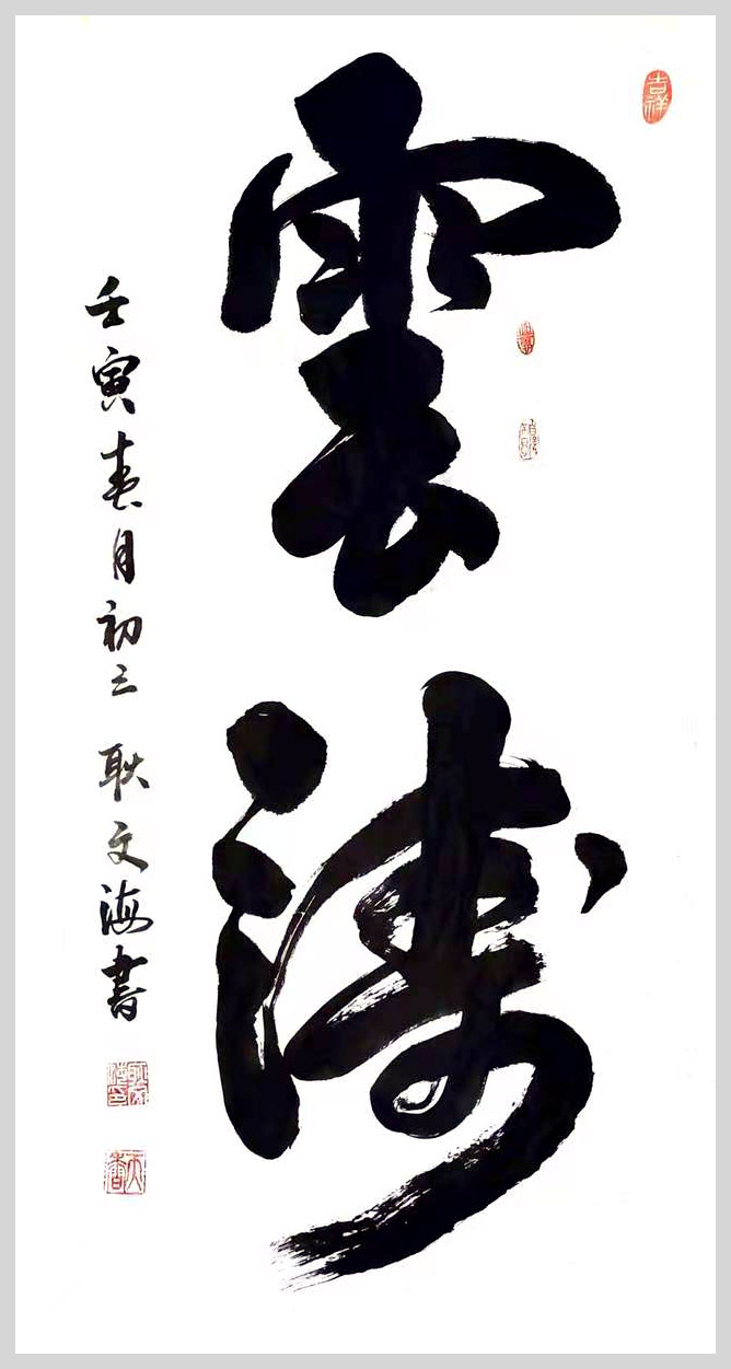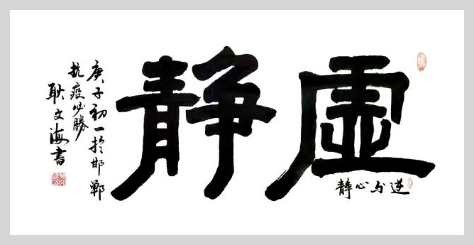 耿文海通诗词、武艺、音律、摄影、中医,融合各种文化元素而成书法美境的功力,还可以通过欣赏耿文海的榜书和草书作品来体会。比如观赏他的榜书《茶》《德》或是草书楹联,禅韵如诗,行笔如武,墨色通律,光影幻化,气象万千。这些深谙文化精髓的书法作品,参加各类书展,屡得金奖大誉,进一步奠定了耿文海身为文化名人,书法大家的艺术地位——走近耿文海,看到的不仅是书法之美,而是文化的博精气势!