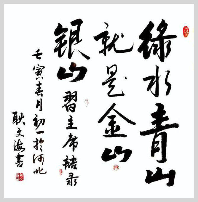 第二个节点是其得到了书法家启功先生的辅教点化。一名书者要成书家之名,坚实的苦修不可缺少,名师点化更是必不可少。听圣师一句话,胜读十年书!所以说得益于启功先生的教化,耿文海的书法道路能一跃曲折,直奔大道,在传承古法的基础上,崩发出极强的创造能力。