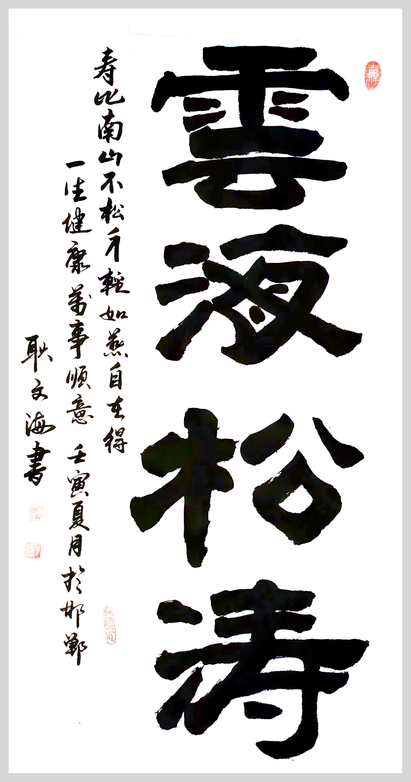 文化大而没有边界,耿文海在文化的海洋里畅游数十载,书法、散文、诗词、美工、音乐、摄影、武艺、中医样样通晓达知,博闻强记,所以树文化名人之威。耿文海的文化积淀,是其书法艺术成就的坚实基础,也是其书法艺术造诣凌云,独树一帜,深得文化精髓的重要原因,更是其书法极有文人儒雅气质的精神支持。