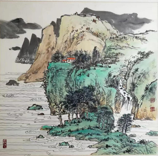 在山水画作上,老师大胆用笔用墨,用细节的勾勒和大片的渲染,表达的浑然天成。