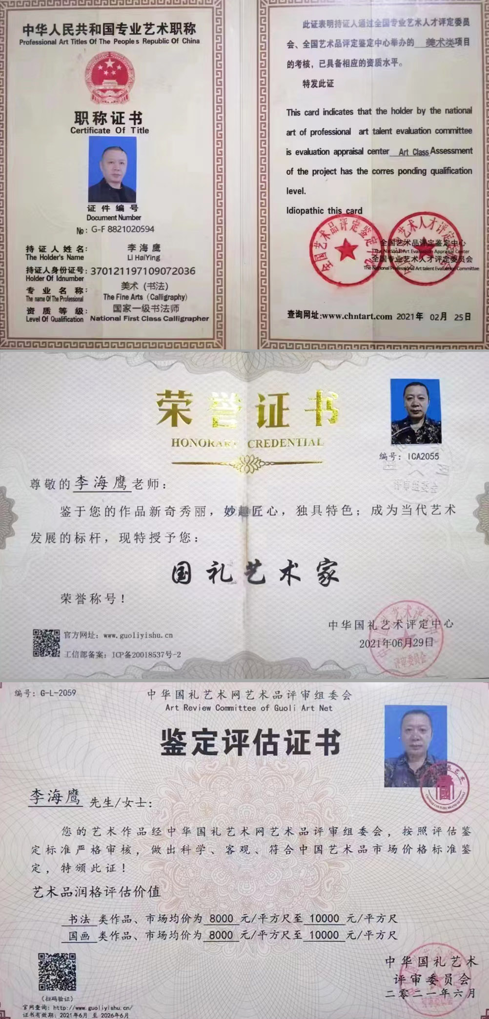 李海鹰,国家级一级美术师、国家级一级书法师。1971年生于山东济南,1973年跟随祖父母在部队生活,养成了艰苦朴素、真诚坚毅的性格。1990年拜师当代著名书画家宋鲁民先生学习书画艺术,1998年毕业于中央美术学院中国画系研究生班。现为中国艺术研究院客座教授、中国艺术品鉴定与评审委员会成员、华夏艺术品收藏家联盟委员会书画部成员,北京盛世一品文化有限公司艺术顾问。