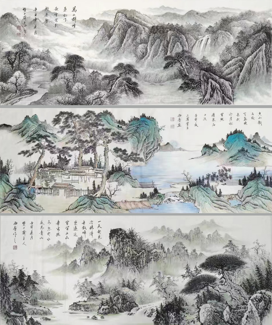 《长城雄风》、《花开富贵》、《江山锦绣》、《富贵祥和》、《江南春早》、《草原之歌》、《滚滚长江东逝水》、《母亲河》、《望远》、《北国风光》、《春夏秋冬》四条屏等。