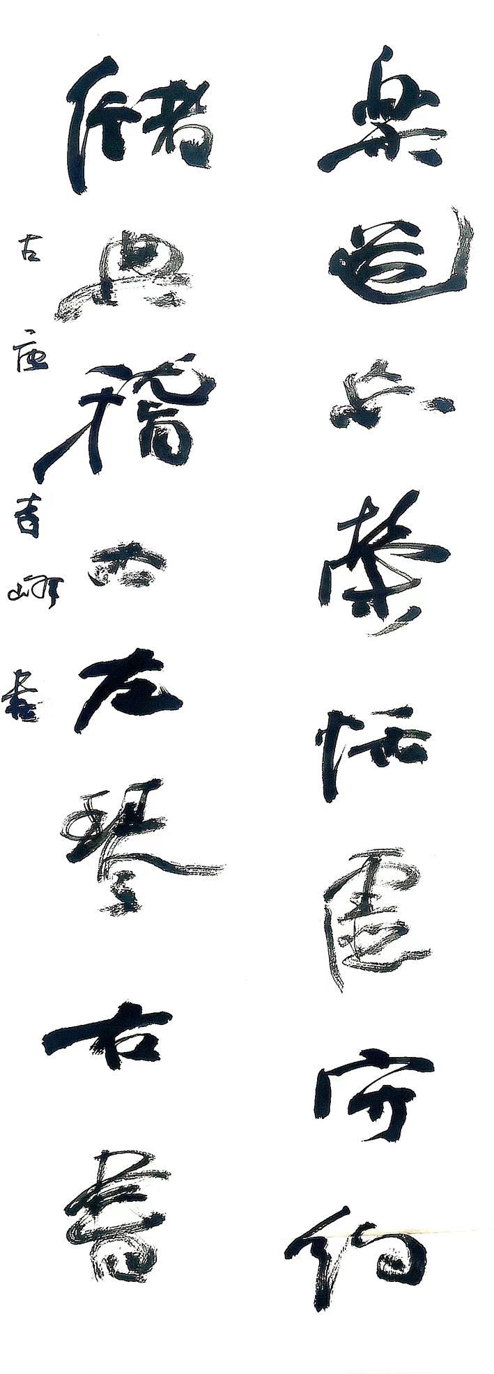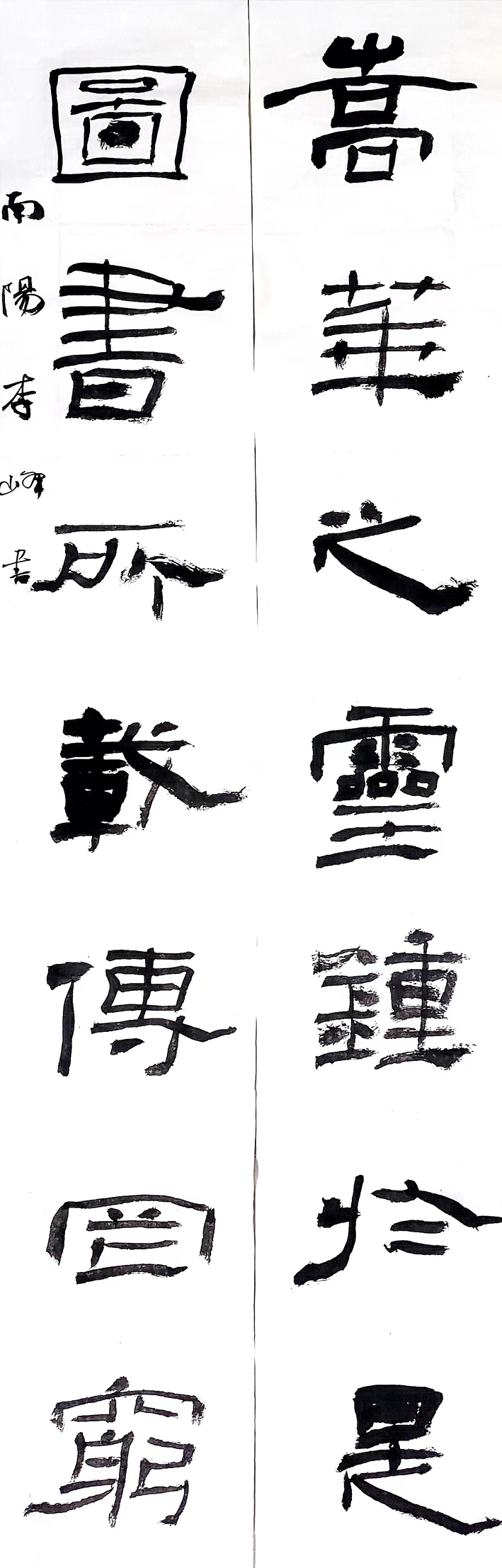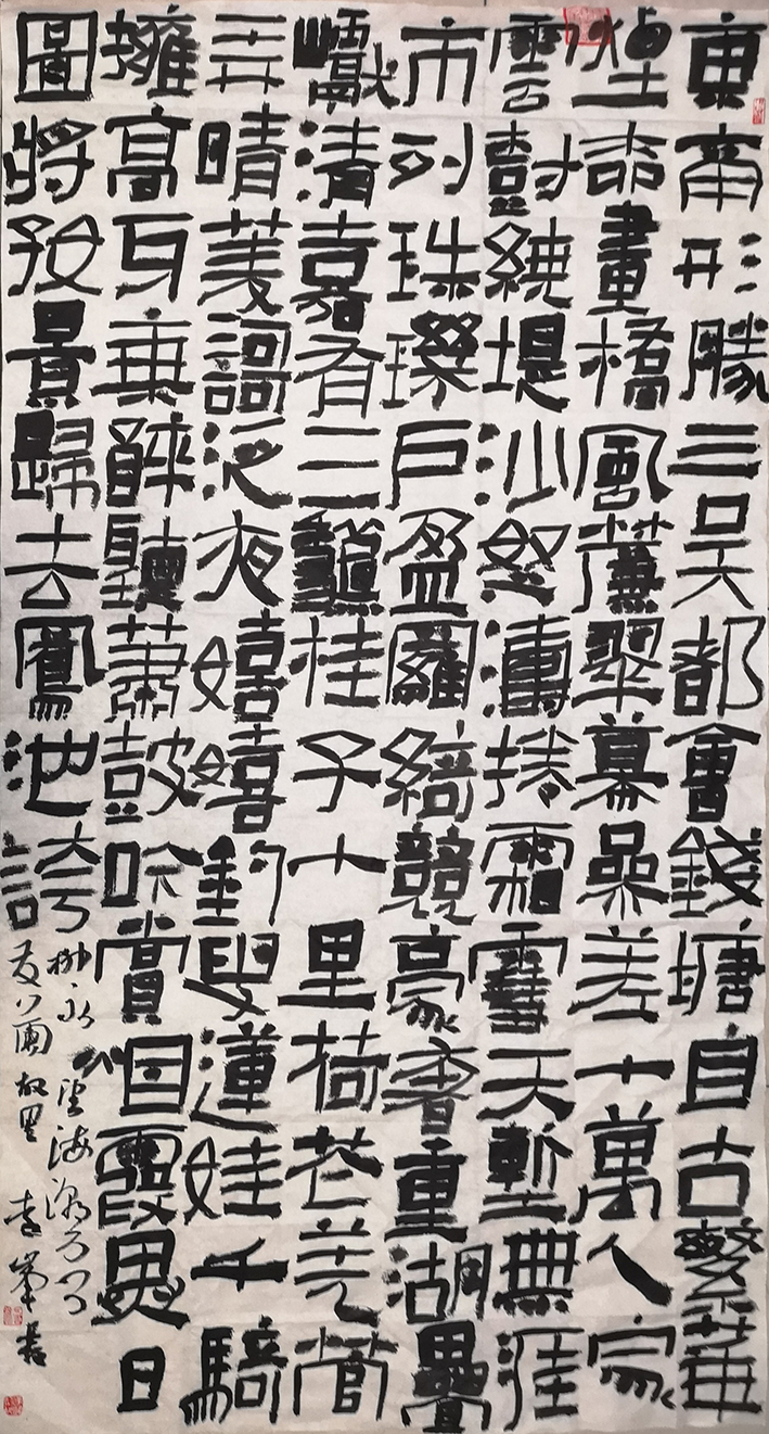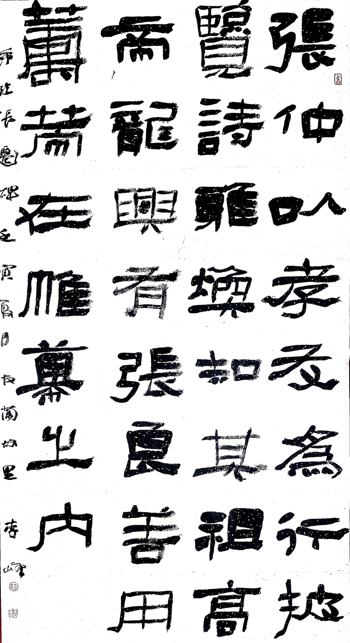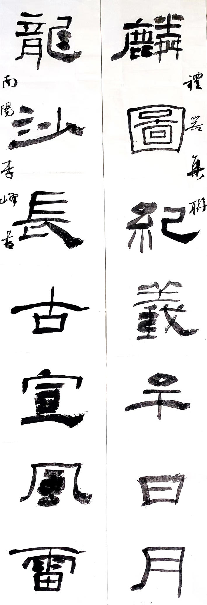 李峰真草隶篆诸体皆能,尤其擅长隶书。他的隶书,乍一看与“蚕头燕尾”的传统隶书差别很大,但细分析,又笔笔有出处,字字有来历。笔法老辣苍茫,大巧若拙,妙于布白构形,寓繁于简,结字腾挪转让,以趣味见长。他的隶书风格可用两个词来形容,一是“胆大”;二是“精妙”。他的行草书取法“二王”手札、《圣教序》、米芾、王铎、张大千等,笔法娴熟,格调高雅。其作品笔划坚而浑、体势奇而稳,章法变而贯,细察之,用笔提按有度,折转自如,线条厚实而灵动,线条运动时的丰润感与弹性之美,舒卷如行云流水般顺畅自然的格调,让人领悟到温柔敦厚的含蓄之旨。