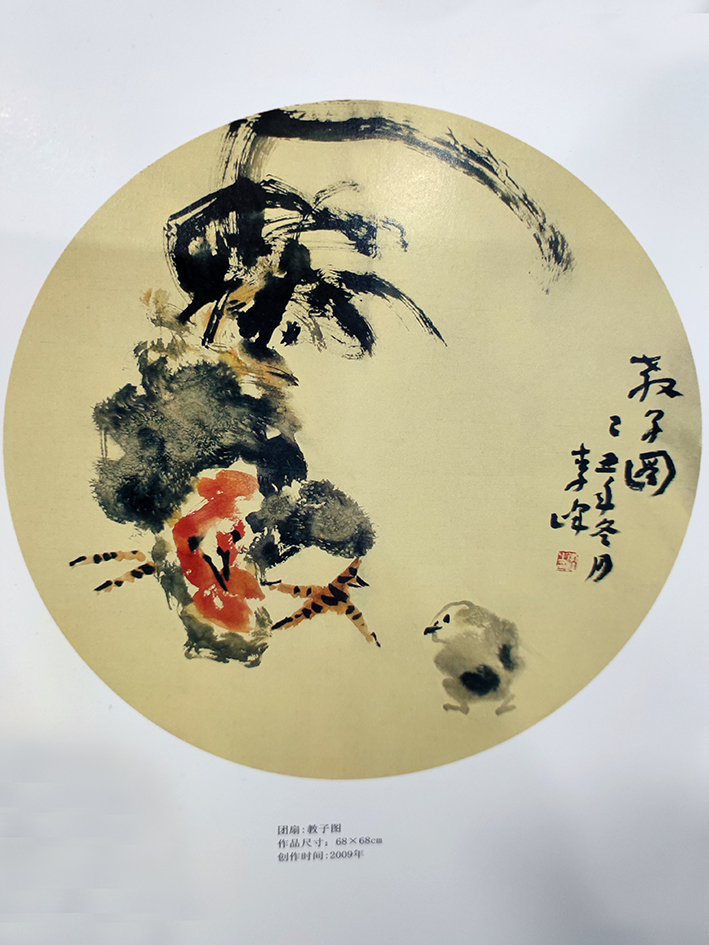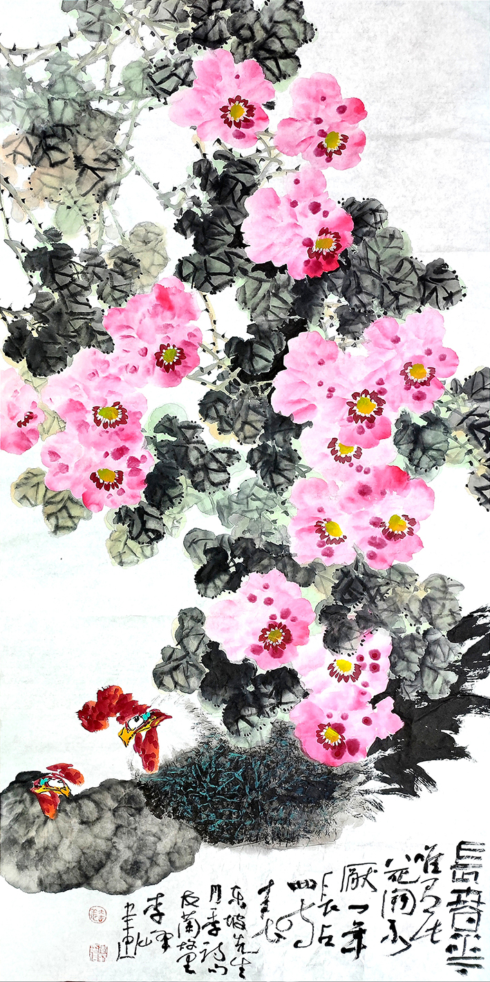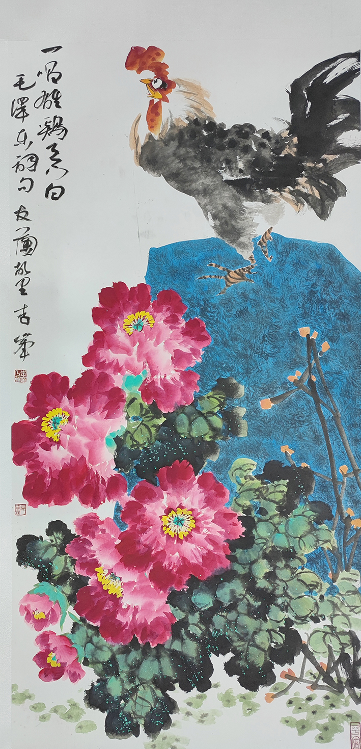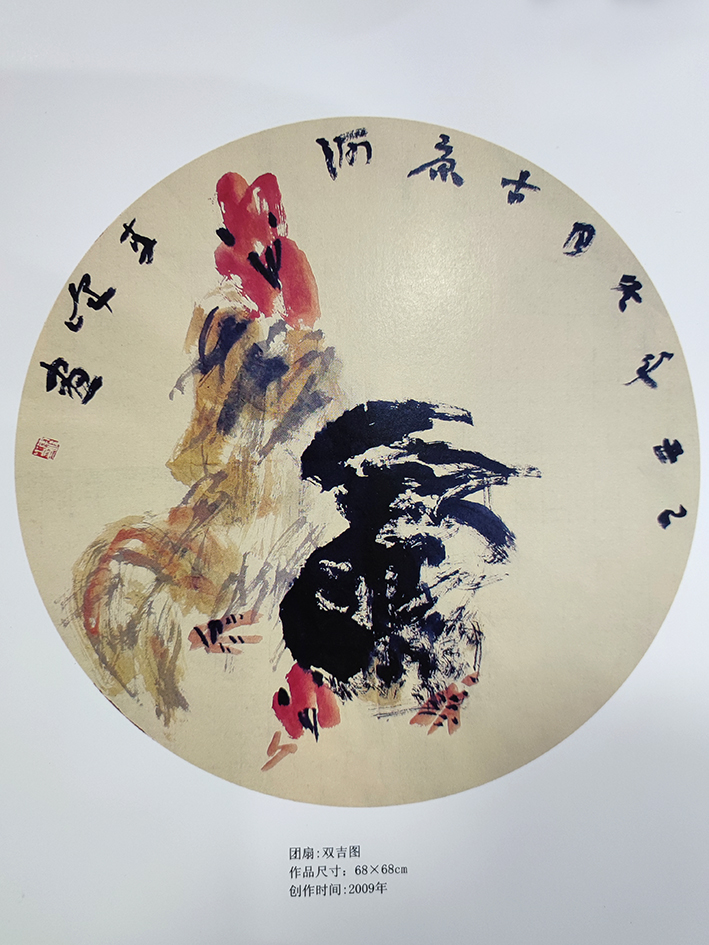 他的画作以花鸟为主,取法齐白石、李苦禅、吴昌硕等,也学现代名人。他的作品看花鸟非静物,不求形似,表达的是散淡闲适。他爱画牡丹、荷花、芭蕉、八哥、群虾、游鱼、雄鸡、蔬菜等,水与墨、动与静巧妙搭配,寥寥数笔,形象跃然纸上。其作品虽小,但既有传统,又有创新,其形式与内涵有机的结合,透射出最强的审美信息,让人观之难忘。