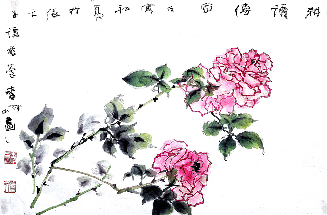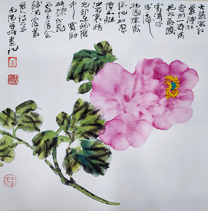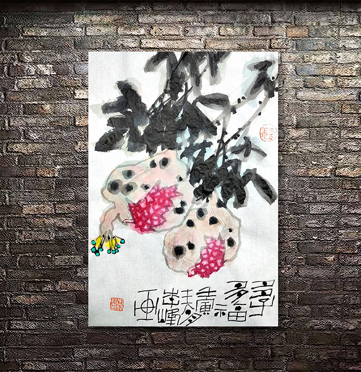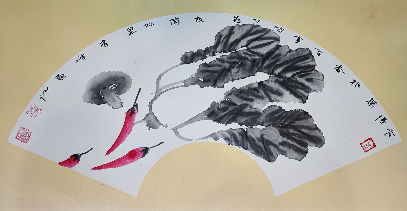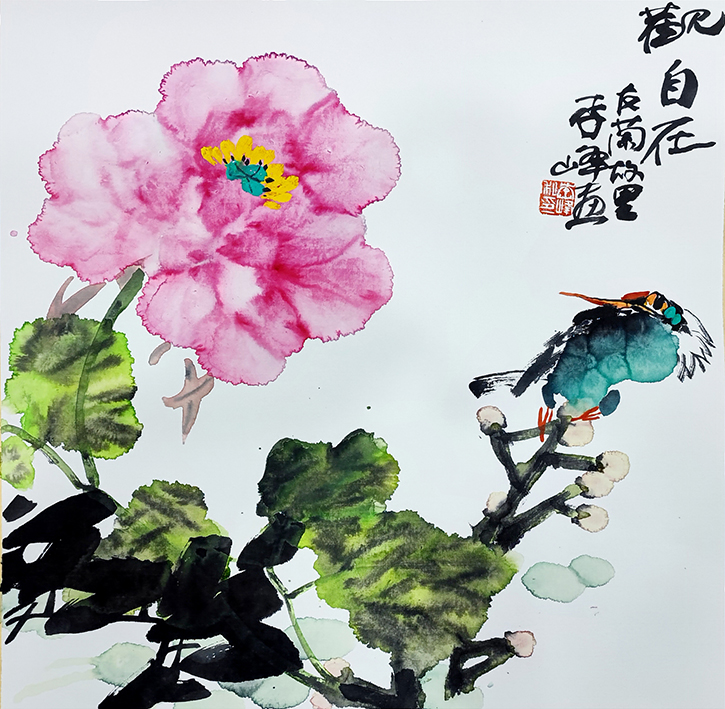 他的画作以花鸟为主,取法齐白石、李苦禅、吴昌硕等,也学现代名人。他的作品看花鸟非静物,不求形似,表达的是散淡闲适。他爱画牡丹、荷花、芭蕉、八哥、群虾、游鱼、雄鸡、蔬菜等,水与墨、动与静巧妙搭配,寥寥数笔,形象跃然纸上。其作品虽小,但既有传统,又有创新,其形式与内涵有机的结合,透射出最强的审美信息,让人观之难忘。