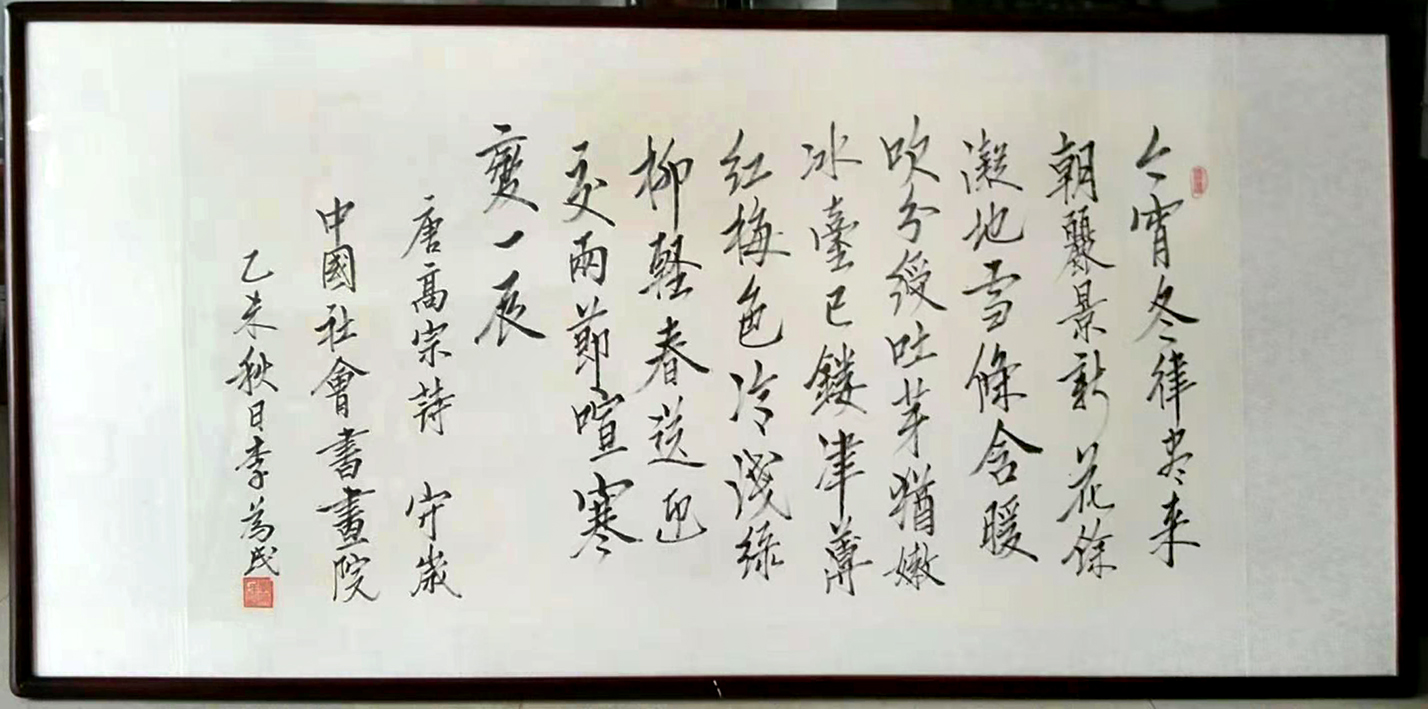 在练习过程中,尤其注重笔画线条质量的训练。练习方切的蹲笔发力,切蹲后转中锋顺势利用发力点迅疾发笔,练习逆锋笔画的发力,逆锋入纸后转中锋,利用发力点涩进匀加速行笔。在练习过程中,刻意加强反冲力,制控力及笔速的训练。只有利用好反冲力才能使笔划的力度最大化地显现出来。只有具备了行笔过程中的制控力才能使笔划达到行止自如,收放有度的境界。只有达到一定的笔速才能使笔划的张力达到最佳效果,才能使笔划的质量达到理想的高度。同时还加强提按,孤线圆转笔画线条的训练。长期临习,写出的行楷榜书既结体舒展大气又气韵开张雄强,既蒼劲端庄又活脱灵动,深受人们的喜爱,其行楷榜书功深艺精,已臻佳境,极适用于单位公司,村庄社区,酒店商场的题写,广泛运用于企业家的办公室,老百姓的厅堂,学生书房的悬掛装饰。