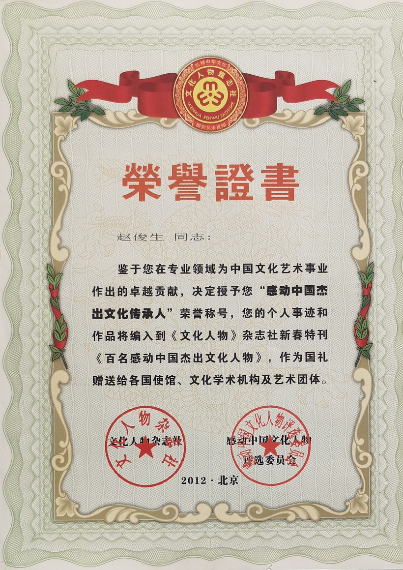 二零一二年由感动中国文化人物评选委员会授予赵俊生《感动中国杰出文化传承人荣誉称号》。