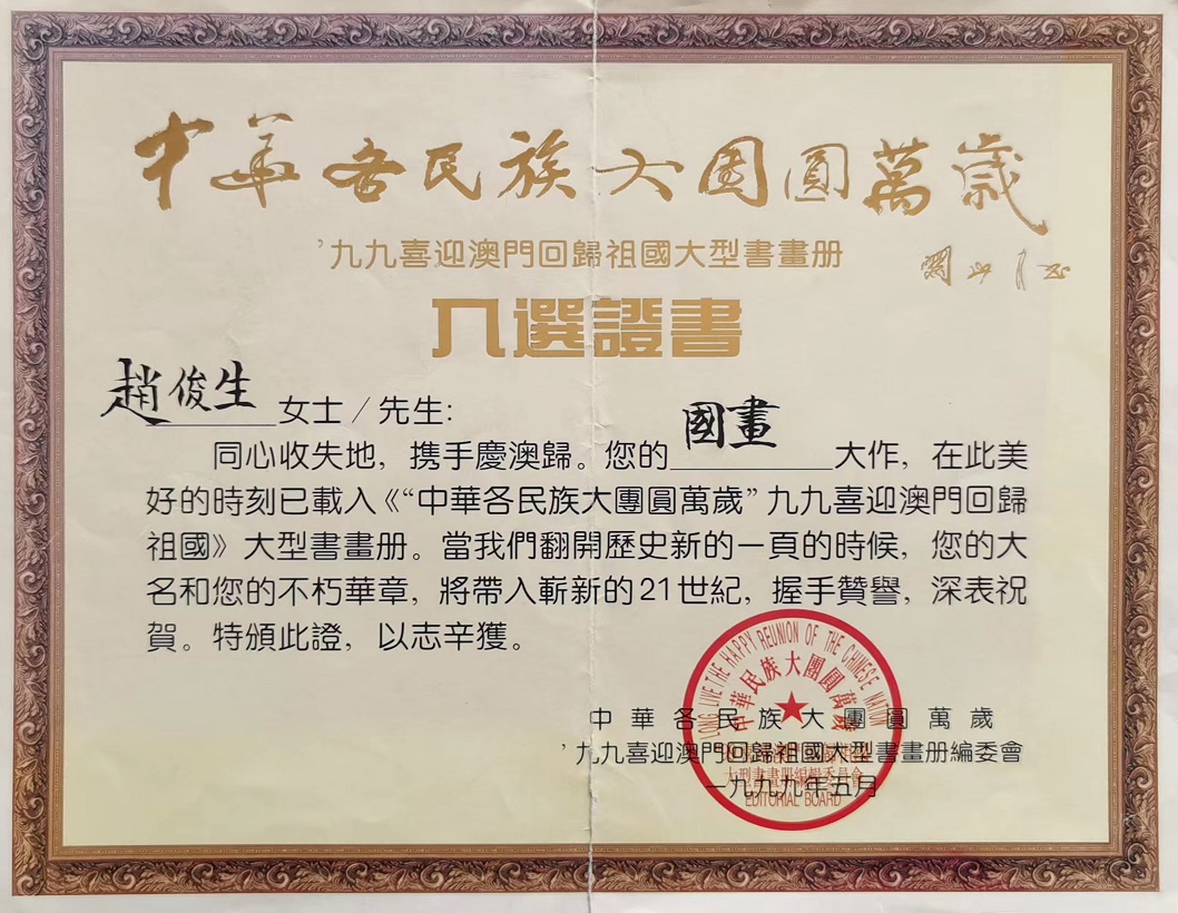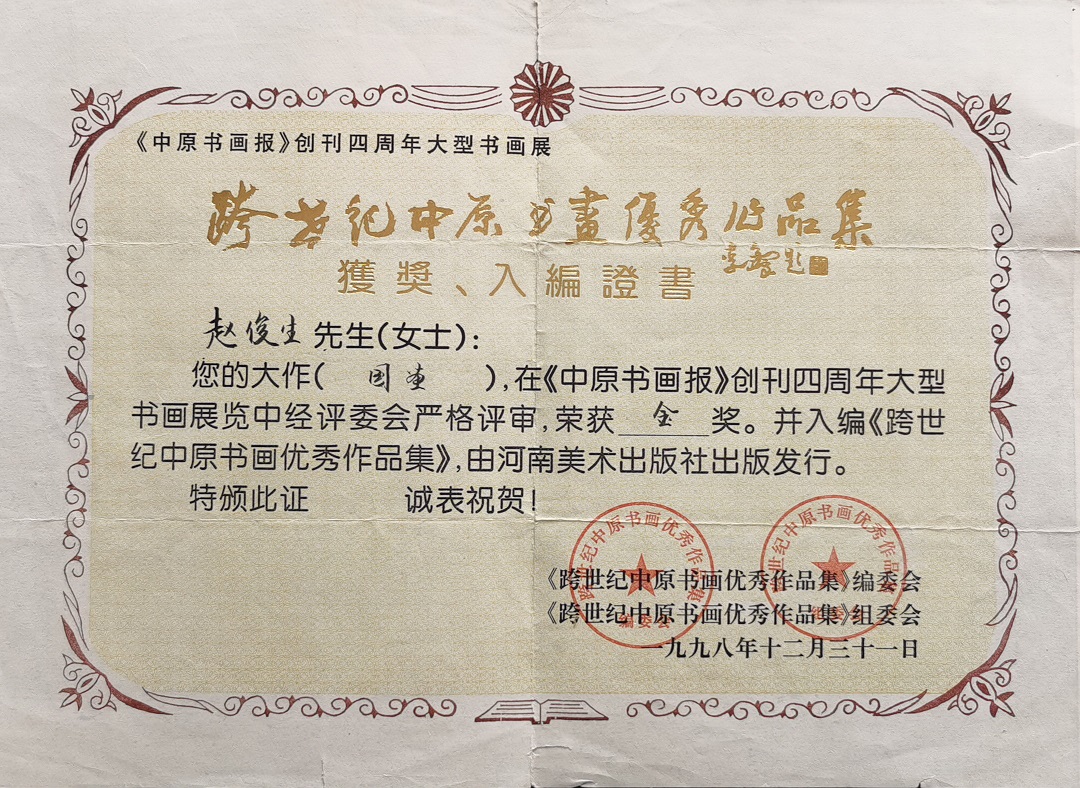 一九九八年十二月,在《中原书画报刊创刊四周年大型书画展》中,国画作品被评为金奖,选入选跨世纪中原书画优秀作品集。