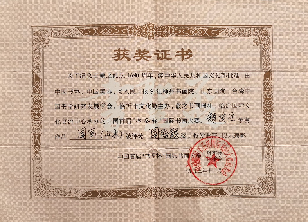 一九九五年由文化部、中国美协、中国书协等单位联合举办的《纪念王羲之诞辰1690年国际书画大展》中国画作品被评为国际银奖。