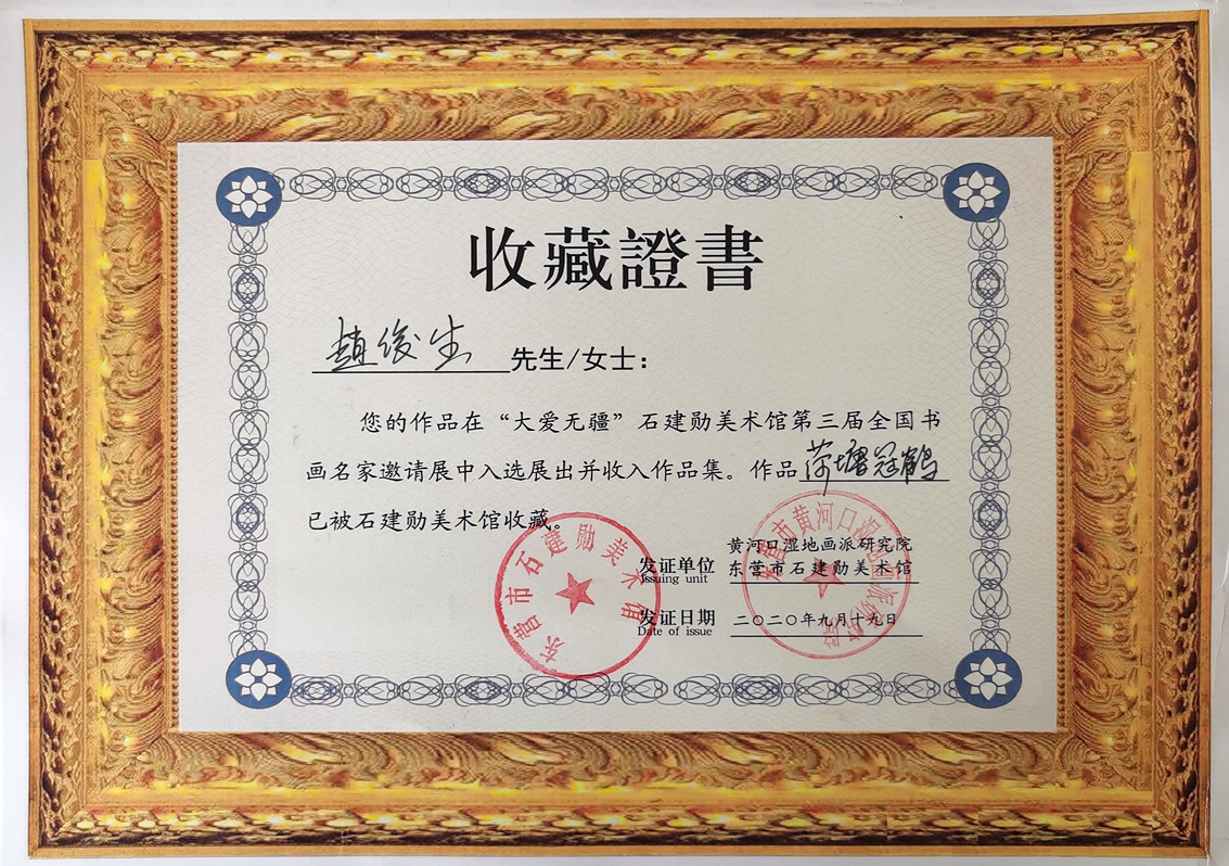 二零二零年九由黄河口湿地画派研究院举办的《第3届全国书画名家邀请展》国画作品入展并收藏。
