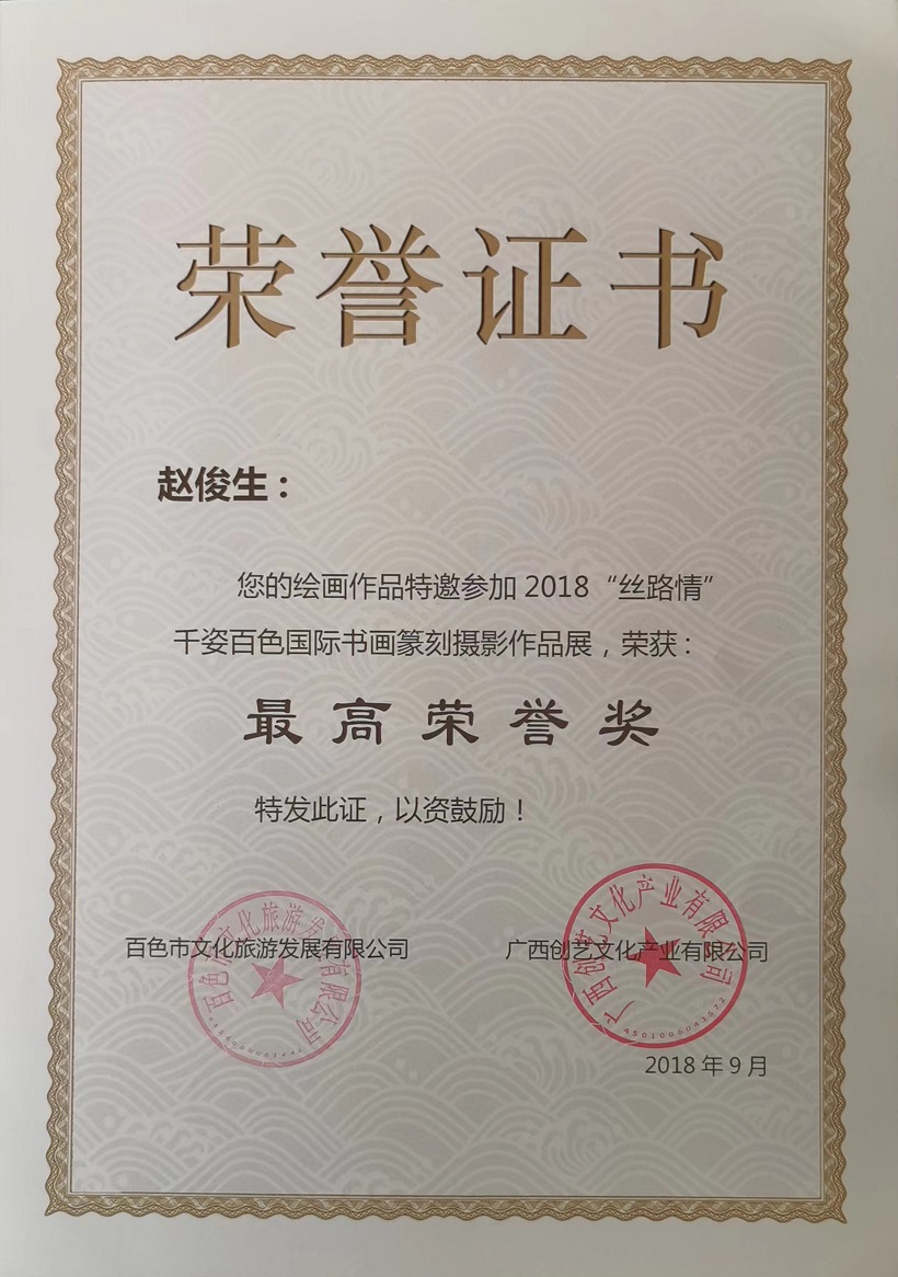 二零一八年九月由广西创艺文化委员会等单位举办的《丝绸情千姿百色国际书画、篆刻、摄影作品展》中,国画作品荣获最高荣誉奖。