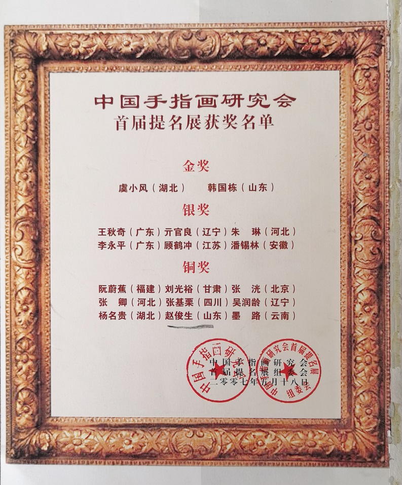 二零零七年由中国中国手指画研究会举办的《首届手指画提名展》,指画作品荣获铜奖。
