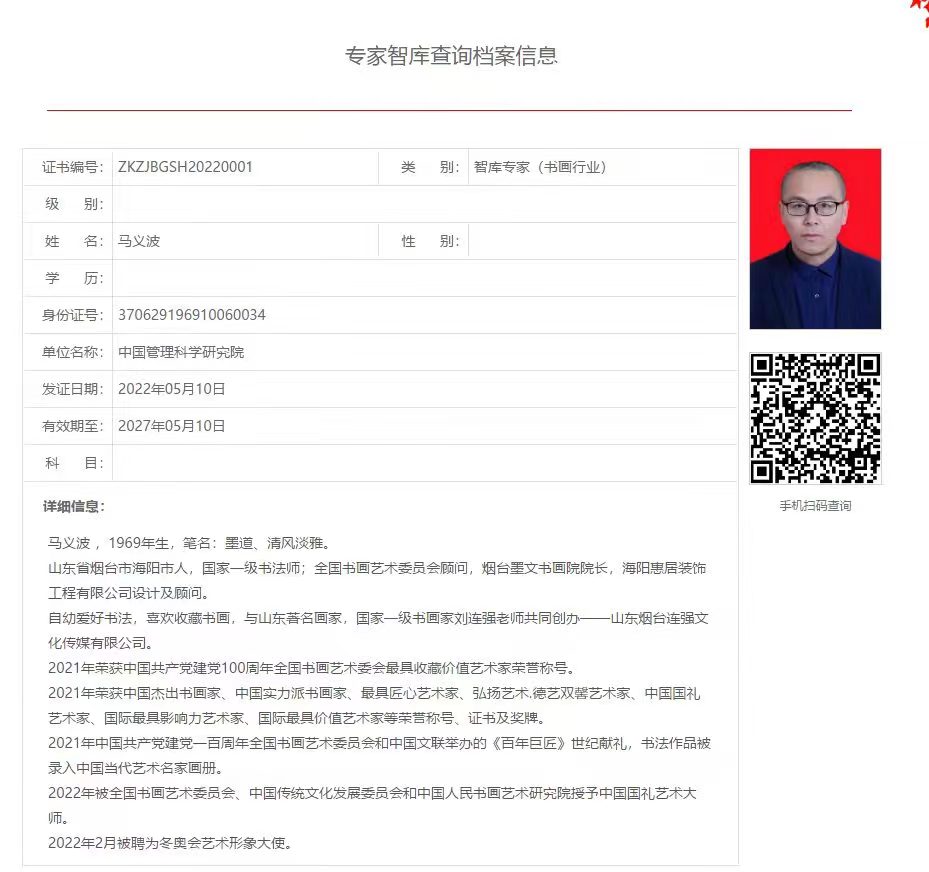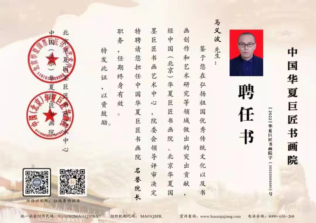 马义波 ,1969年生,笔名:墨道、清风淡雅。山东省烟台市海阳市人,国家一级书法师;中国华夏巨匠书画院名誉院长,全国书画艺术委员会顾问,烟台墨文书画院院长,海阳惠居装饰工程有限公司设计及顾问。自幼爱好书法,喜欢收藏书画,与山东著名画家,国家一级书画家刘连强老师共同创办——山东烟台连强文化传媒有限公司。2021年荣获中国共产党建党100周年全国书画艺术委会最具收藏价值艺术家荣誉称号。2021年荣获中国杰出书画家、中国实力派书画家、最具匠心艺术家、弘扬艺术.德艺双馨艺术家、中国国礼艺术家、国际最具影响力艺术家、国际最具价值艺术家等荣誉称号、证书及奖牌!2021年中国共产党建党一百周年全国书画艺术委员会和中国文联举办的《百年巨匠》世纪献礼,书法作品被录入中国当代艺术名家画册。 2022年被全国书画艺术委员会、中国传统文化发展委员会和中国人民书画艺术研究院授予中国国礼艺术大师。2022年2月被聘为冬奥会艺术形象大使。