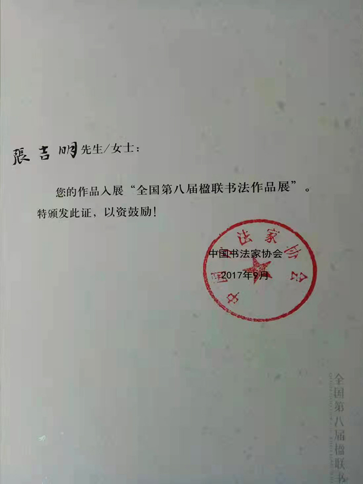 曾入展全国第八届楹联展,(中国书法家协会主办)。