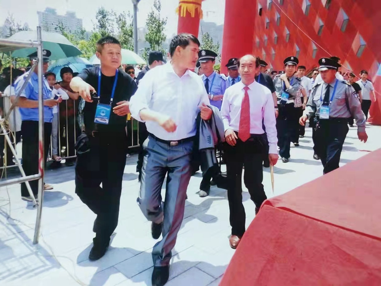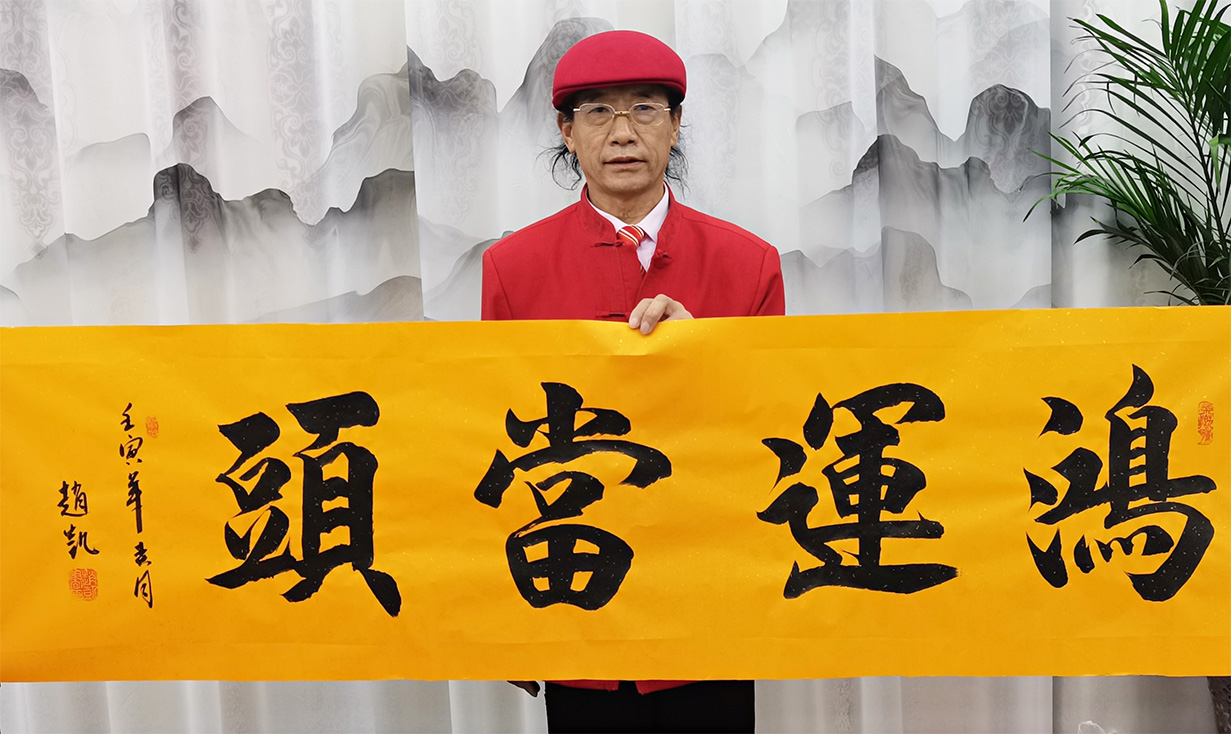 与大衣哥朱之文受邀一起参加山东省文化产业博览会,现场展示非遗绝学悬笔、悬纸、悬腕三绝书法,书写《鸿业腾飞》,并被活动组委会永久收藏。