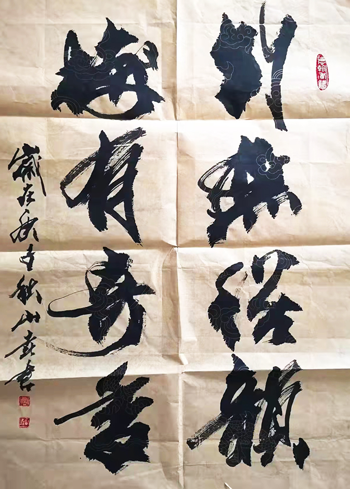 济南长清“武中奇”先生见其人正心善虔诚勤奋,收其为徒,言传身教,山壵受武先生言传身教潜心研习,字里行间传承融入了恩师钢筋铁骨的书艺风格,每年多次带书作前往南京昤听生点拨,牢记武先生教晦,碑拓为本,参悟己魂的教晦,久不释怀,遇名碑名贴,秀笔妙峰,细品心摹省悟,博取众先人书法碑帖之长,勤勉磨励。无数个夜以继日笔墨书写至天亮,毫不夸张的说,五十余年下来其所用墨可吨称、纸用车量、笔以千计,刻苦修炼笔下功夫。