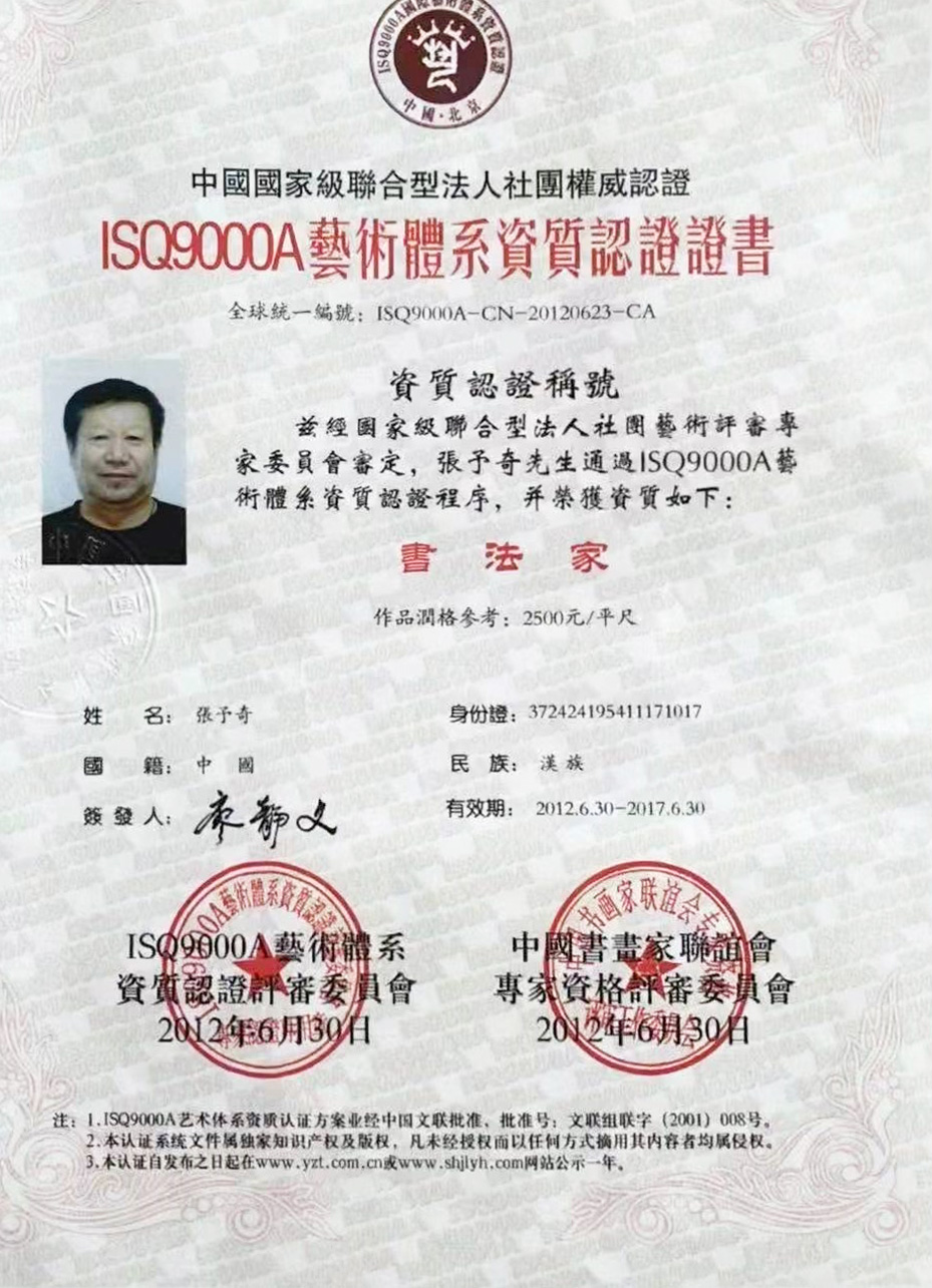 2012年中国ISOQ9000A艺术体系资质认证优秀书法家