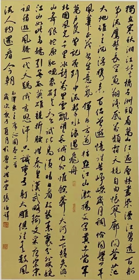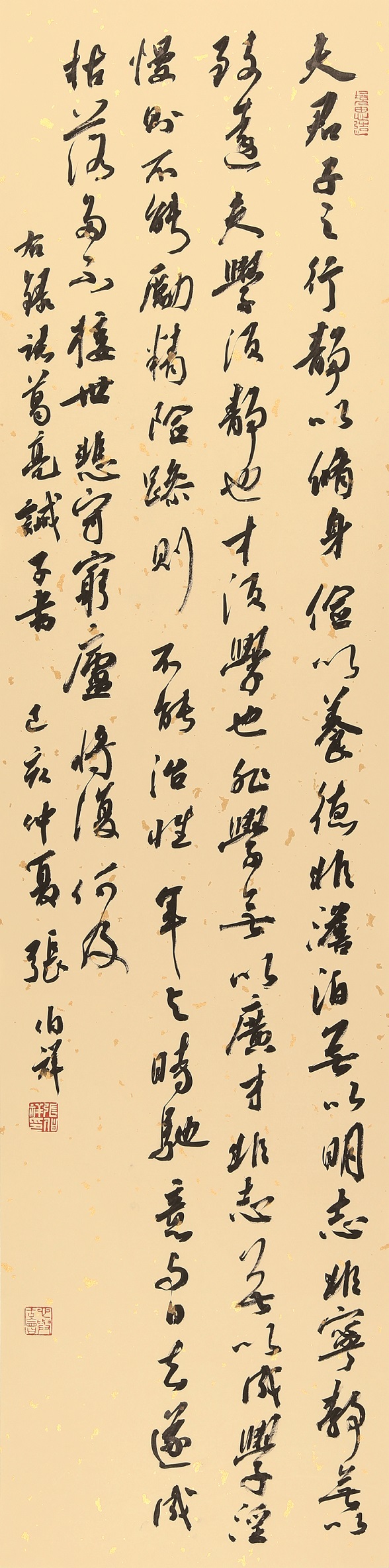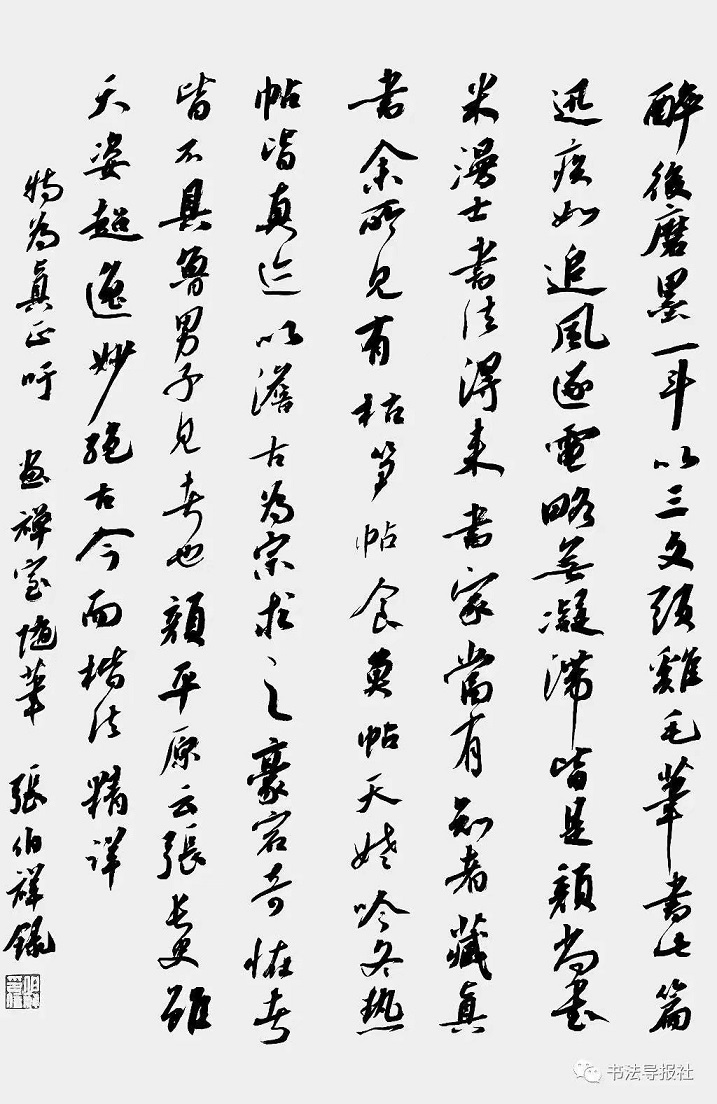 三、任何一门艺术的创作,都是作者寻找自己的过程,人的一生会呈现出不同的精神面目,但其中精神气质的恒一性与个人修养的的纯度会在作品中得到一种展示,尤其是有了相当的功力之后,有的人走向了优雅,有的人走向了粗野,有的人俗不能医,有的人彷徨不定.....张伯祥的书法正走在文秀劲健,走向传统的幽深之处,走在面目渐渐清晰的时候。笙箫夹鼓,幽林曲涧,勃然而兴,溢于笔墨。他的书法带着那种天然的韧性与包容,带着强烈的传统气息逼人面目,但它不刺眼,不激烈,不造作,不是缠绵悱恻,而是直爽的、犀利的、优柔的、缱绻的,咫尺有万里之势,铺排有流韵之光,挥运如山风海雨,落笔有柔情衷肠。书法正在和他这个人融为一体,书法在改变或巩固着他的气质与格调,也在使他更加地理解传统贴近传统,更加虔诚地以传统的面目构筑着自己的精神世界。书法与人渐渐地融合着,书法的那种刻骨的真实与他密切地联系着,这本身就是一种成熟,-种健康。他不是那种炫技性的书家,而是一个勤奋的机敏的书家,是在对传统不断地打磨吸收体会之后,所表现那种朴实,那种生动,神气横溢,笔势欹镧。十载功夫费评章,笔中情调尚开张。欲将翰墨书心我,好字淋漓就几行。这是我写给伯祥的诗,以作为我们十几年友谊的互勉。伯祥正当年,后面的路会更长,以他的实力与勤奋,相信会让我们在他的作品面前不断地“眼前一亮”。