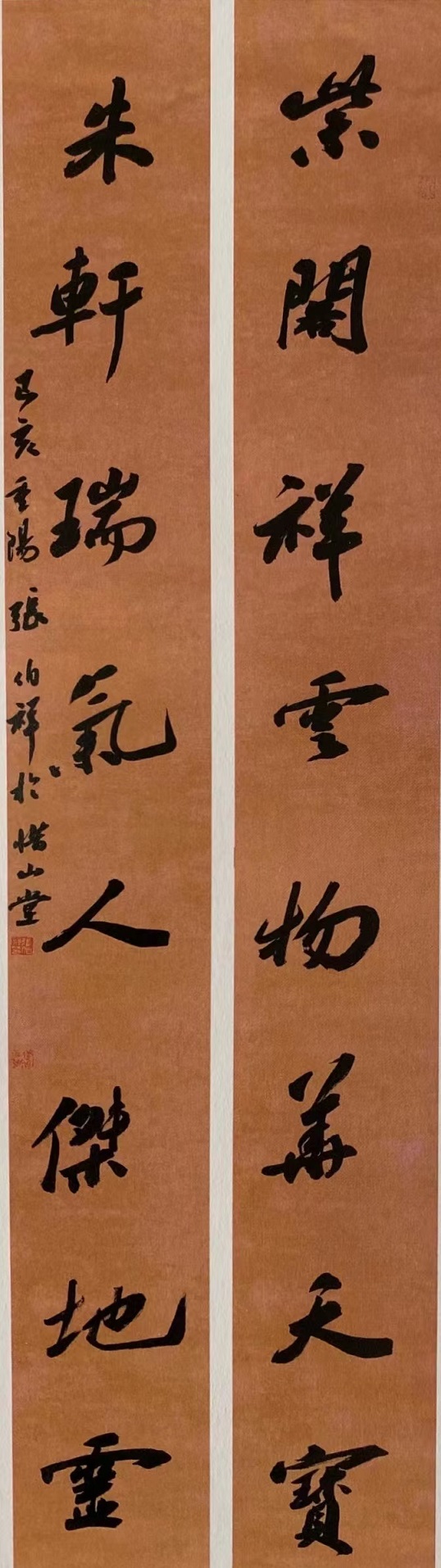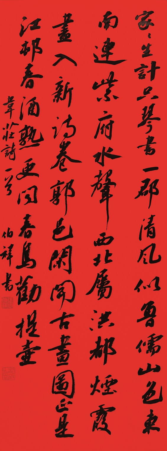 他擅长行书,尤其在苏东坡身上下了功夫,写苏已经近十年,十年的浸润滋染,以苏字的面目呈现出自我的绚丽光华,兼以颜真卿和何绍基的融合,文秀中蕴藉力量,激情中参融法度,飘逸潇洒,矜严藏拙,吐故纳新。当代写苏字的人很多,面目趋同,伯祥能够从苏字中体会一种流动婉转的力量,尤其是从颜真卿《争座位帖》的基础上把苏字的宽和兼让,力透纸背,端庄流丽、刚健婀娜都熔铸于笔端,把自己的理解与透悟淋漓尽致地表现出来。“梦泽云边放钓舟,坡仙墨妙世无俦;天花坠处何人会,但见春风绕树头。”这是启功先生赞扬苏东坡书法的一首诗。伯祥取东坡的尚意之风,将苏东坡“把笔无定法”变成了一种有定法的节律。将东坡的小字意趣写出了一种大字的气势,这是伯祥的所得。当代人喜好把传统的小字写成大字,有所得亦有所失,大字中须有凝聚之气。伯祥所写的苏字,就把颜真卿的那股厚实顿拙之气贯于其间,所以他能把苏东坡的风格也写得很厚,这是很不容易的事情。