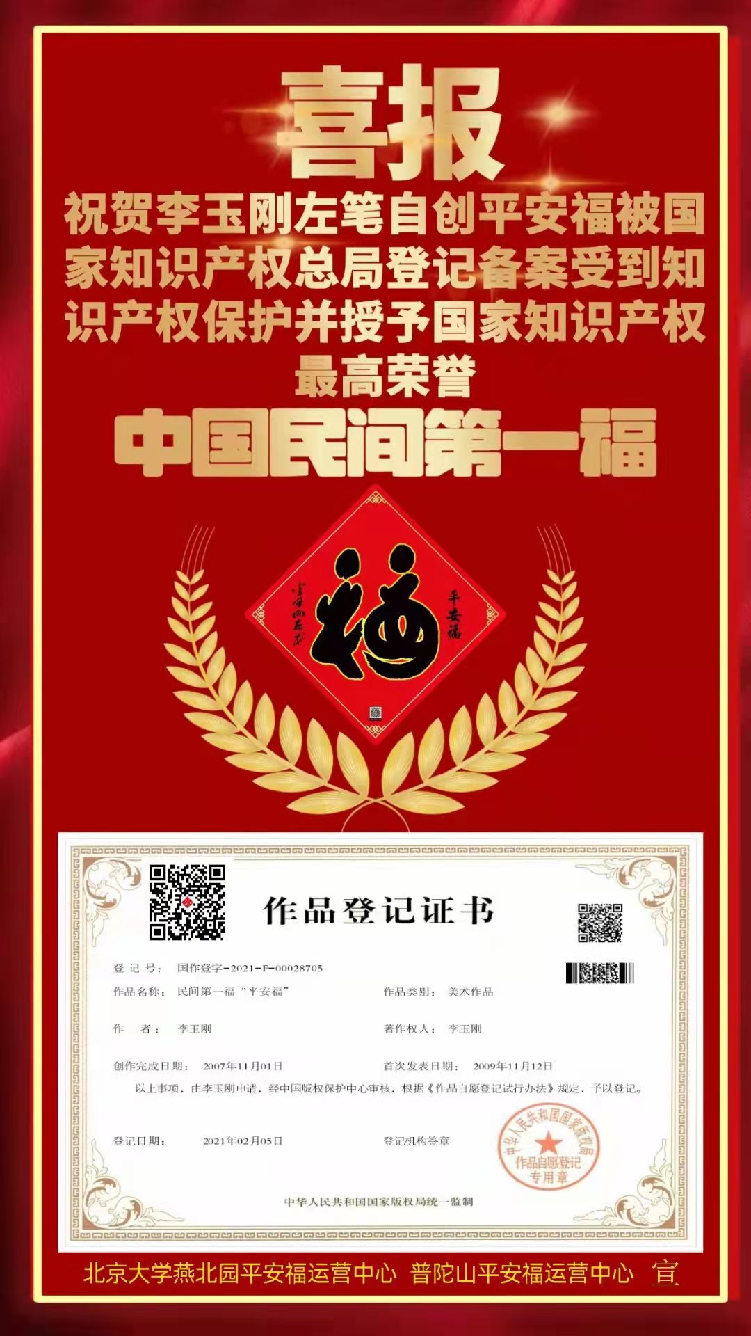2021年,经国家知识产权局批复,李玉刚平安福被认定为中国文化产业知识产权最高荣誉“民间第一福”光荣称号。”